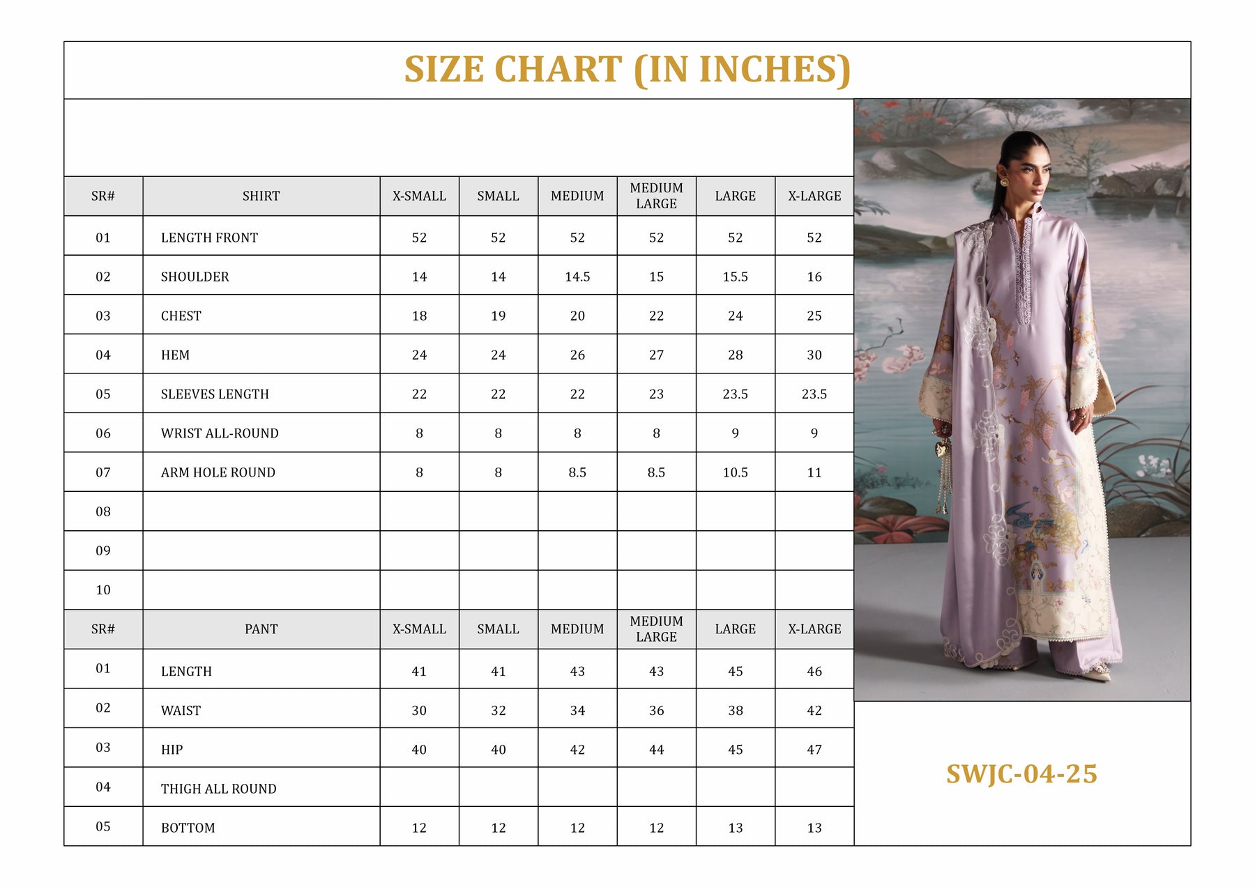 A graceful lavender rod silk outfit adorned with an elegant Ikebana-inspired painting print. The off-white side panels feature delicate embroidery, adding refined charm. Paired with an intricately embroidered dupatta for a complete sophisticated look. (Imported fabric)