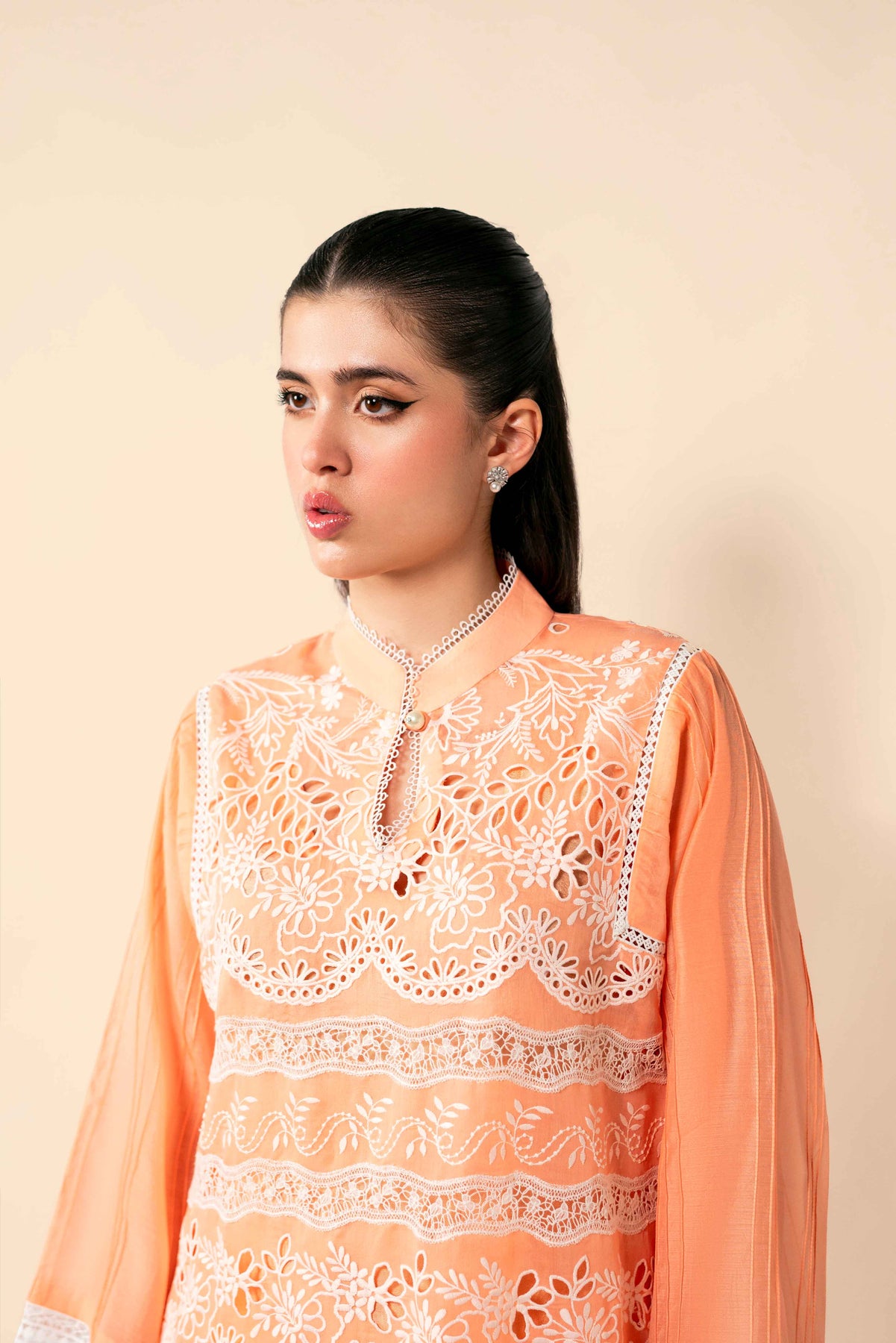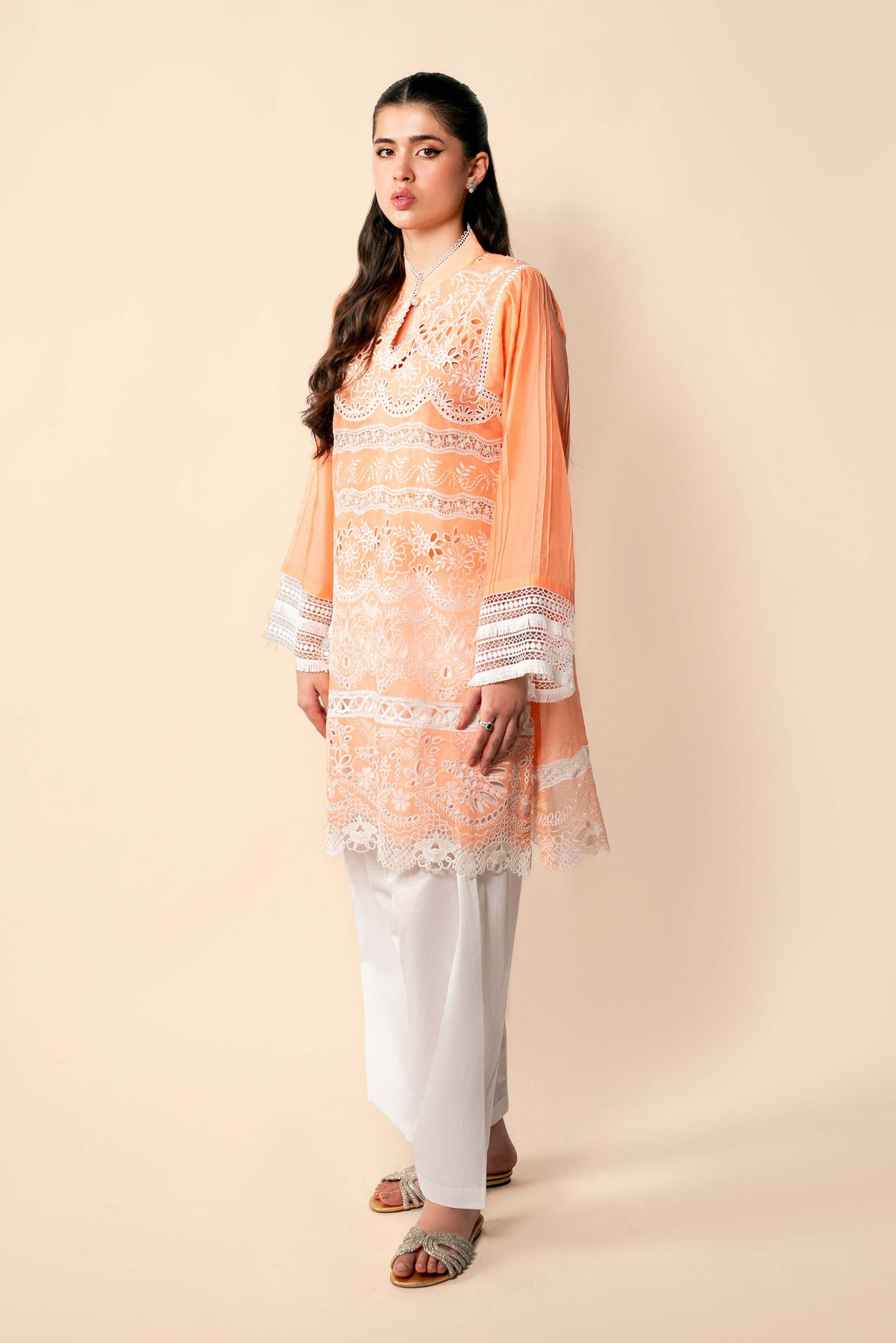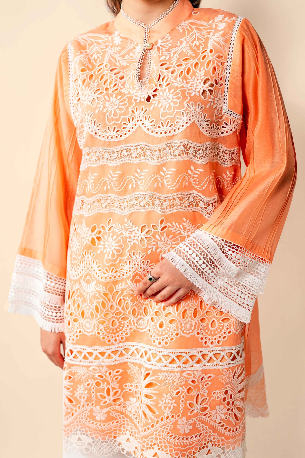Peach silk organza with laser cut, Boring and schifli embroidery. All technique used in this loose kurta.