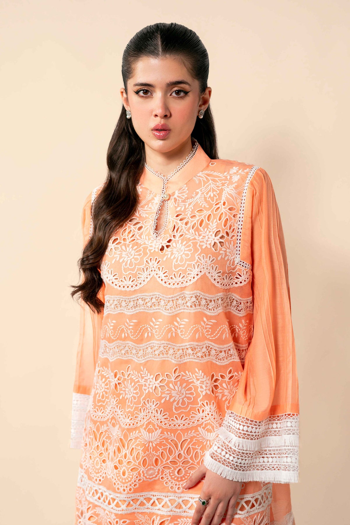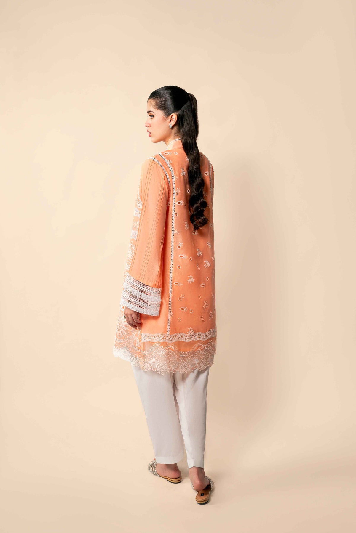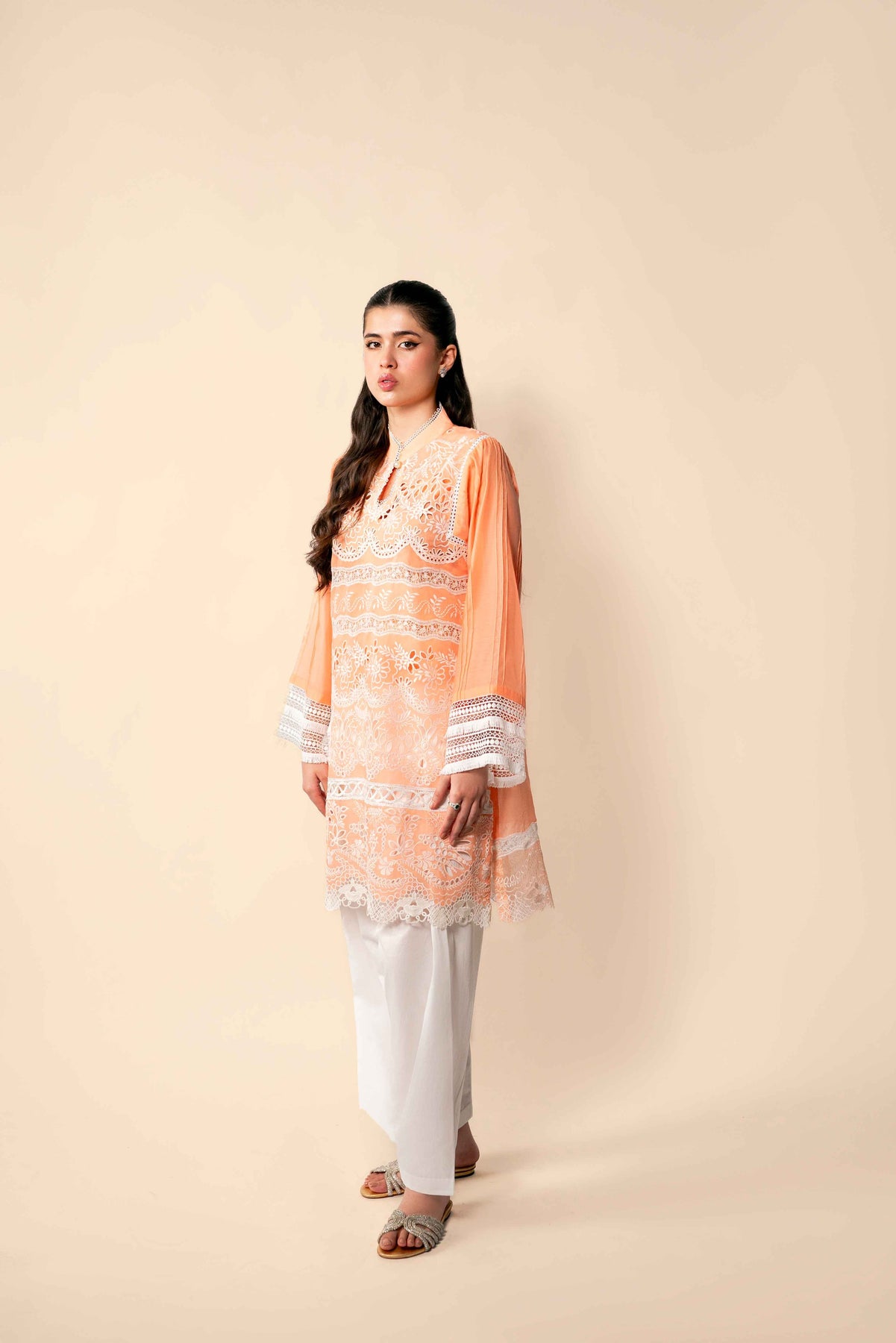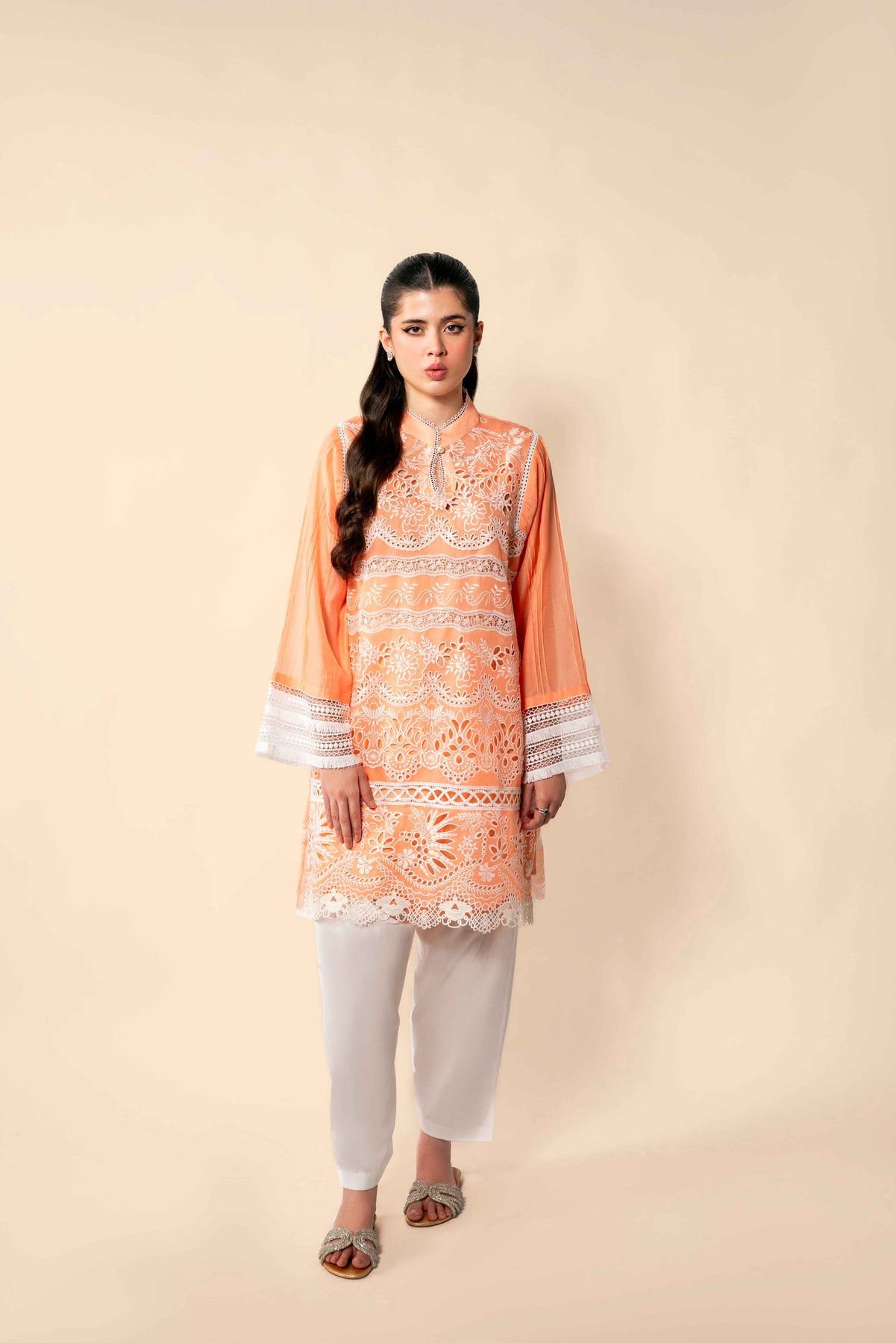 Peach silk organza with laser cut, Boring and schifli embroidery. All technique used in this loose kurta.
