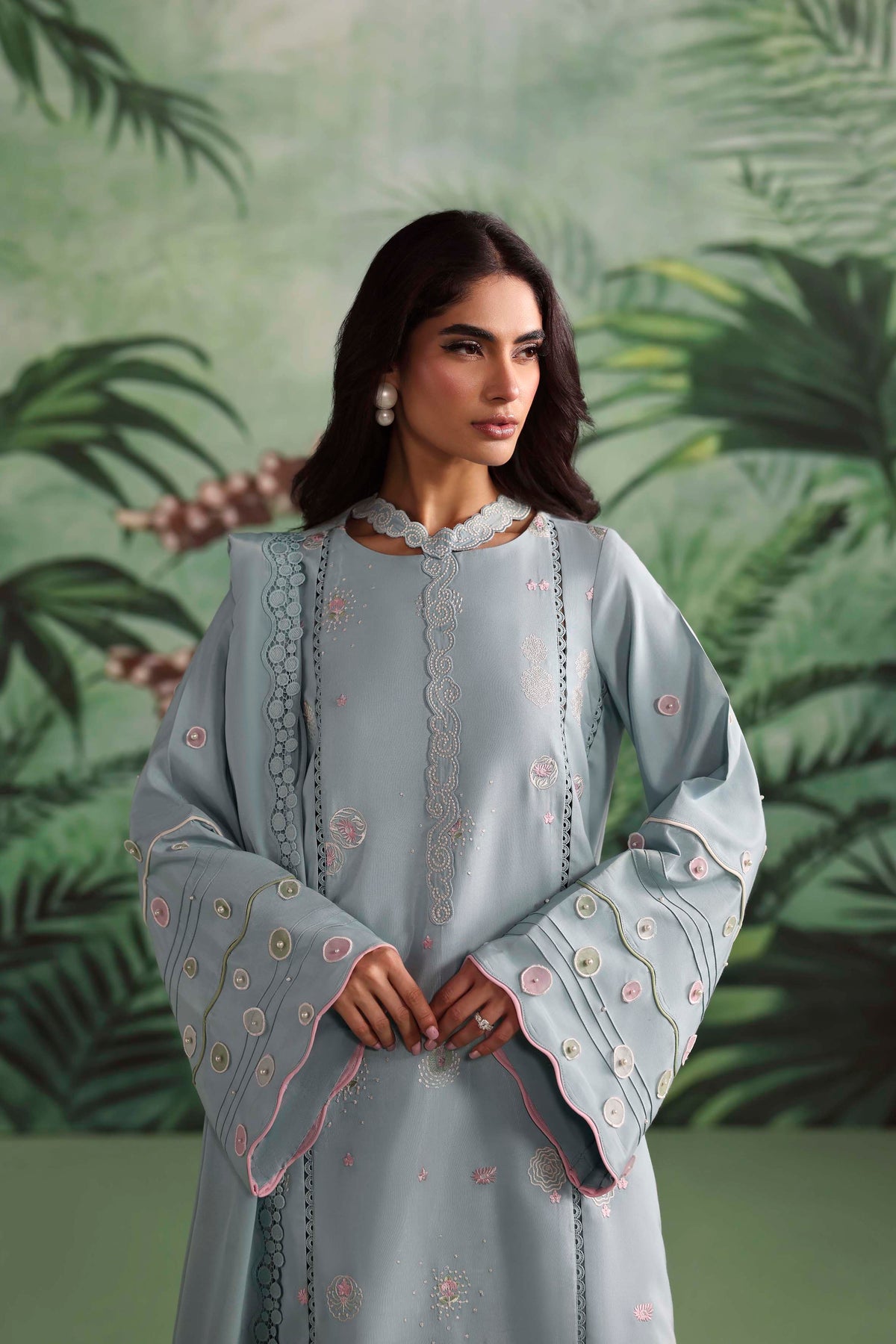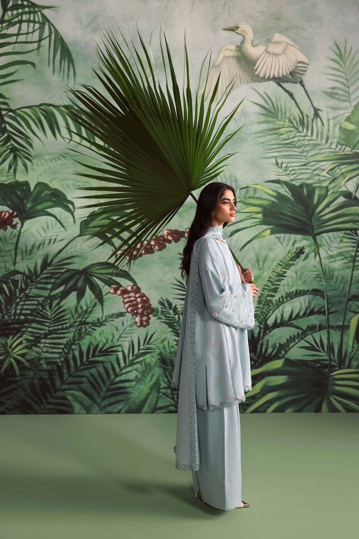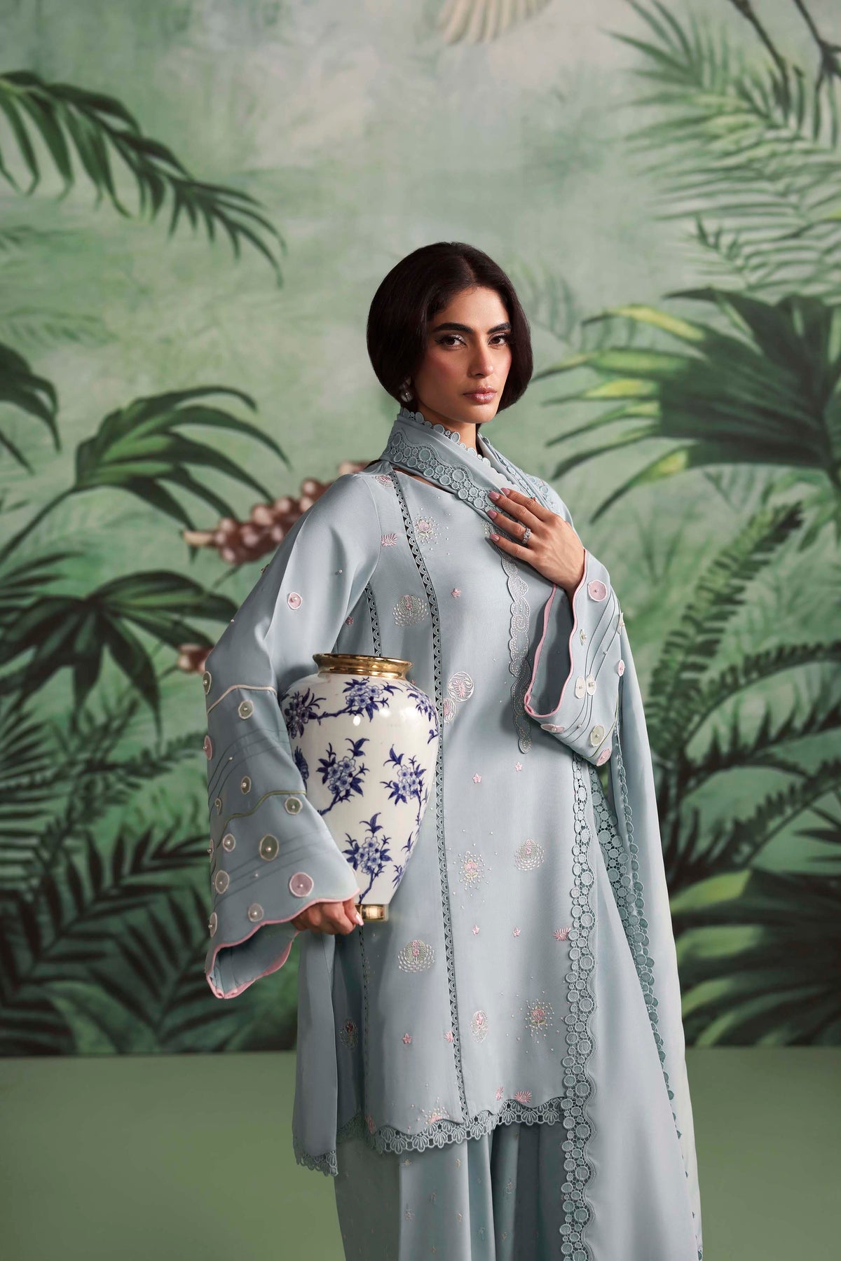 A charming baby blue heavy silk ensemble featuring elegant embroidery on the shalwar, shirt, and dupatta. Its soft hue and refined detailing make it perfect for a variety of occasions. A timelessly beautiful 3-piece suit. (Imported fabric)