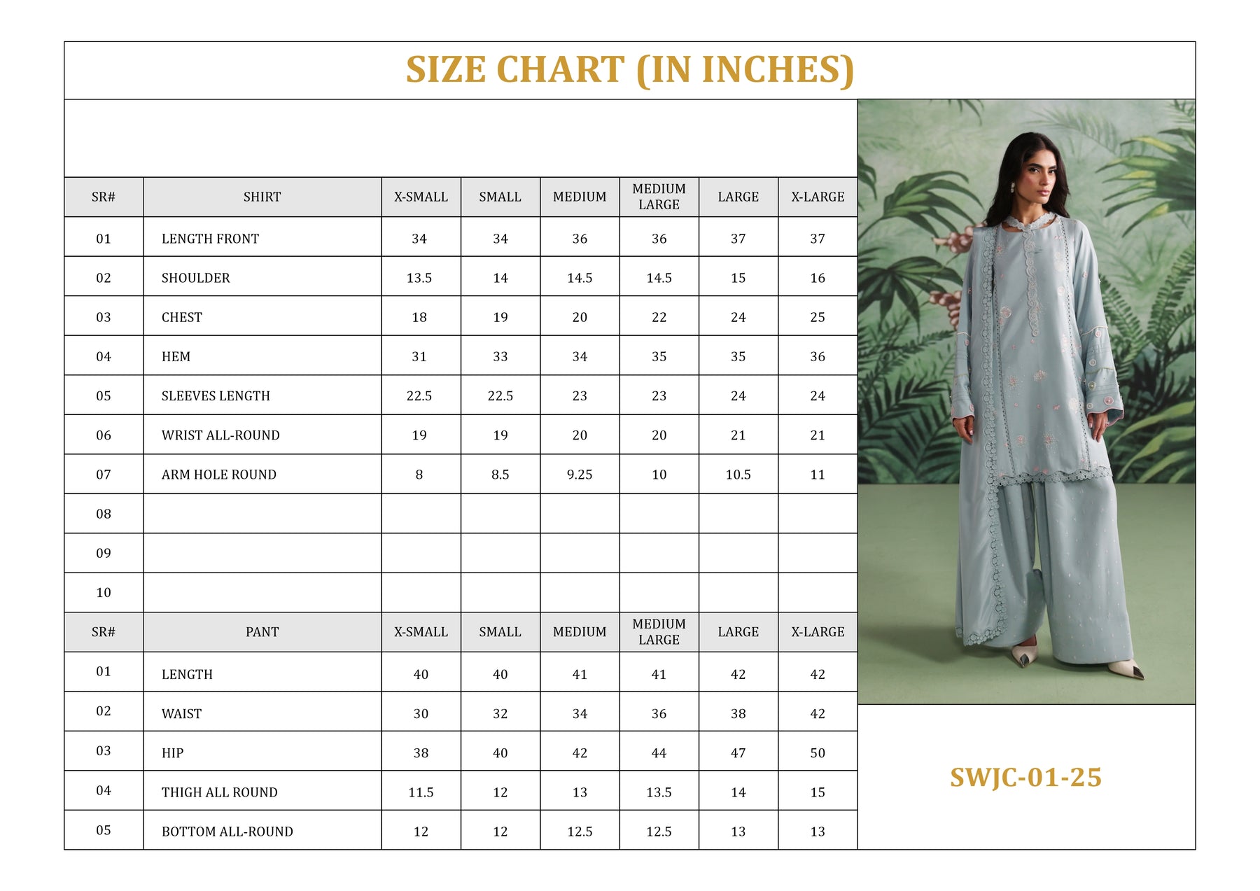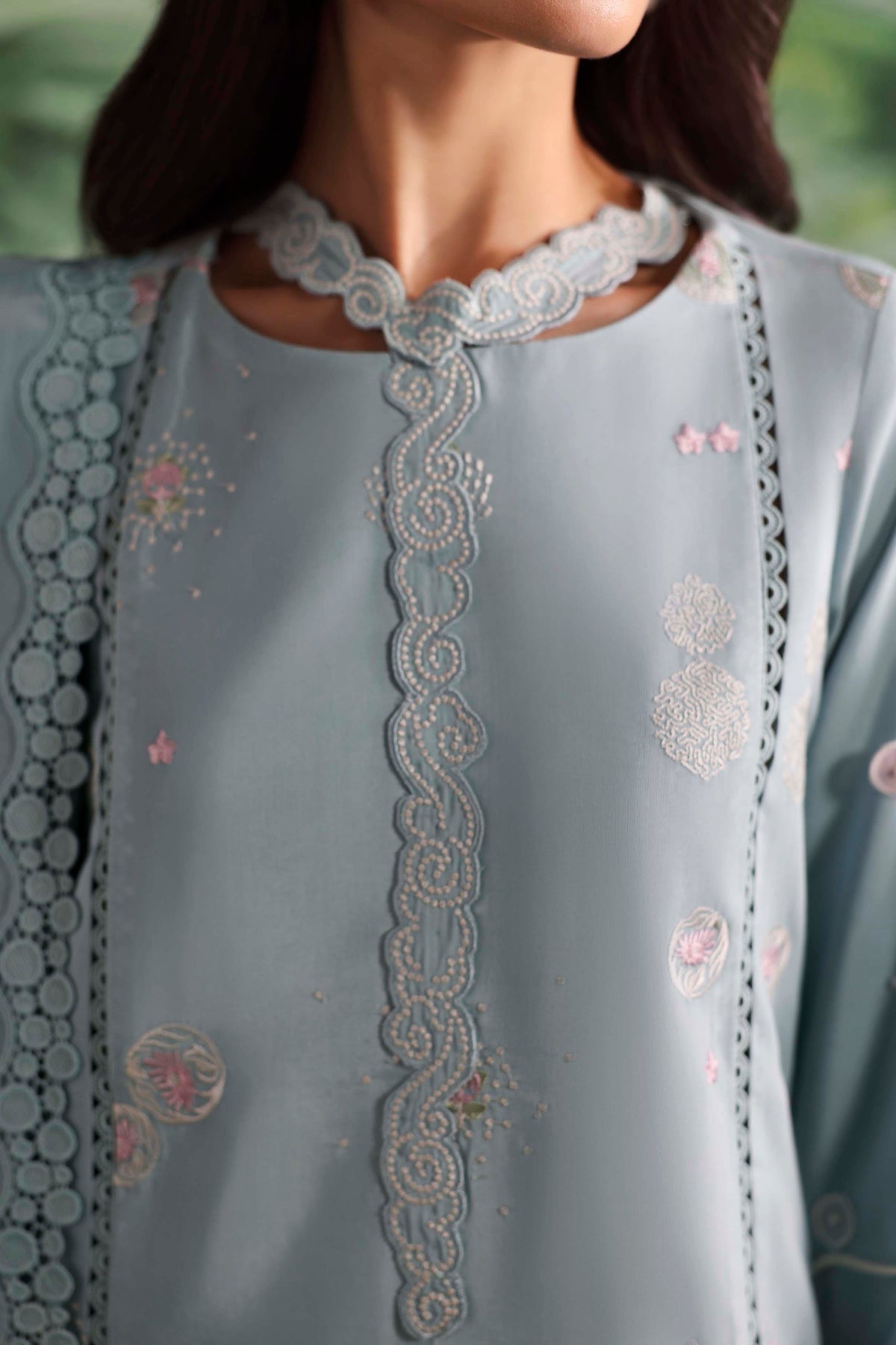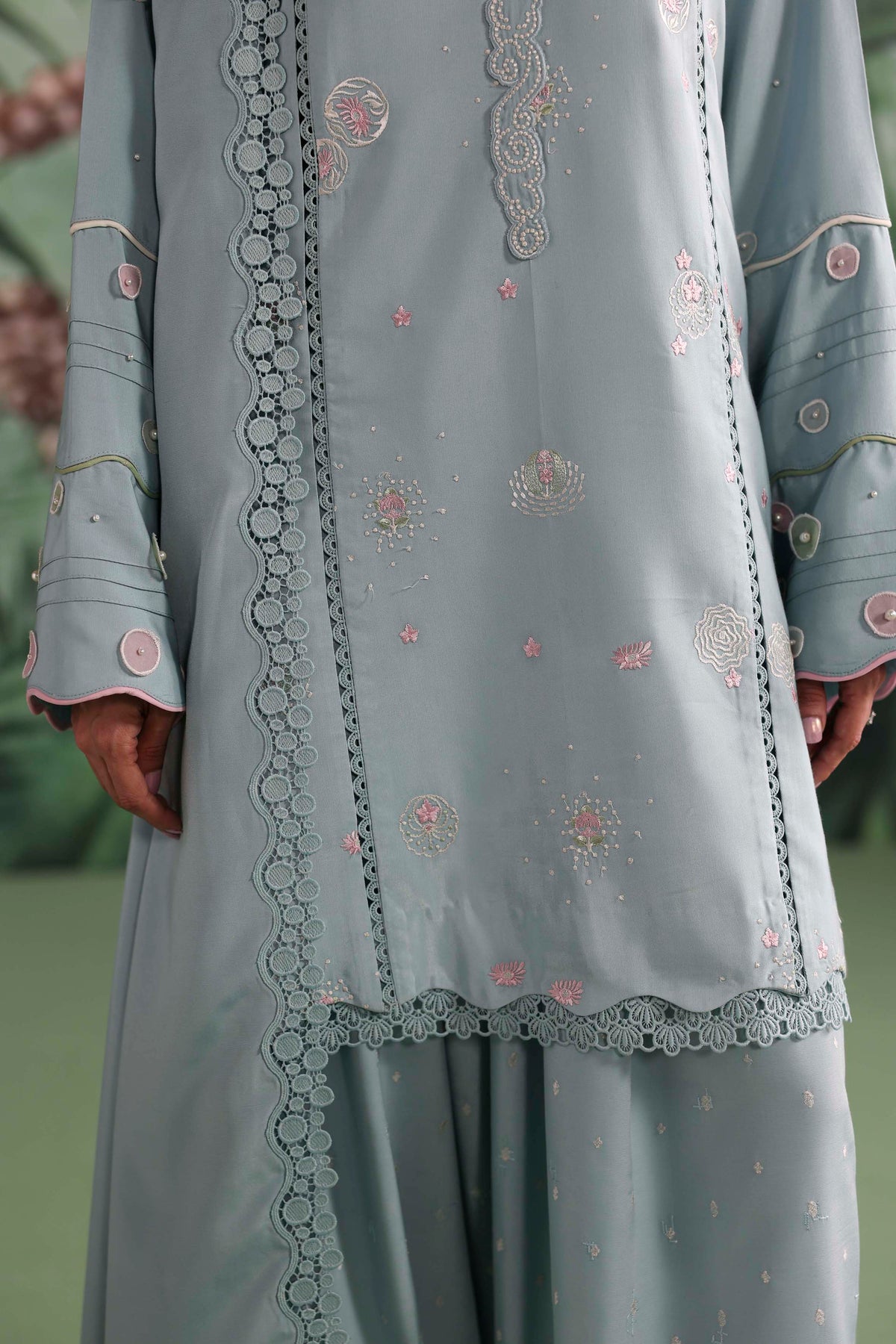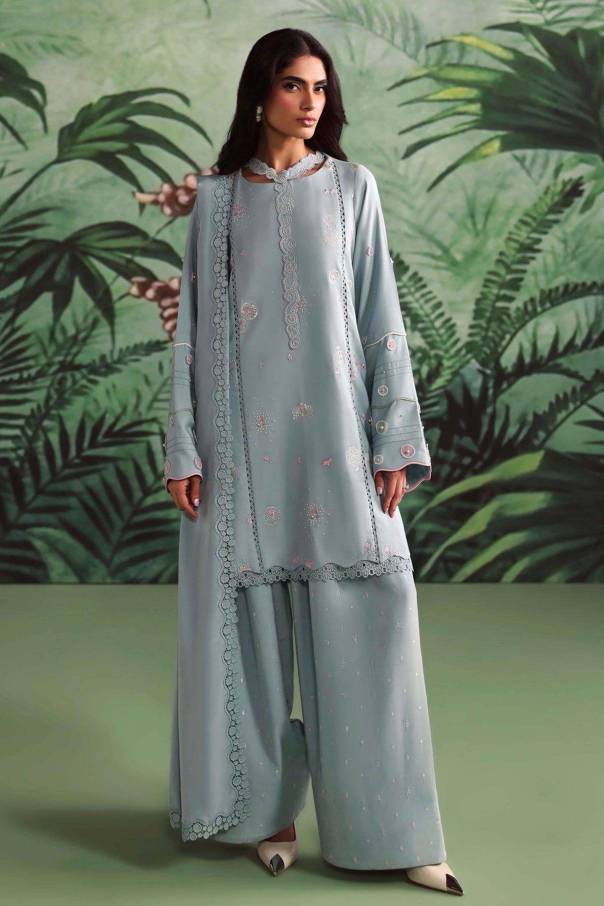 A charming baby blue heavy silk ensemble featuring elegant embroidery on the shalwar, shirt, and dupatta. Its soft hue and refined detailing make it perfect for a variety of occasions. A timelessly beautiful 3-piece suit. (Imported fabric)