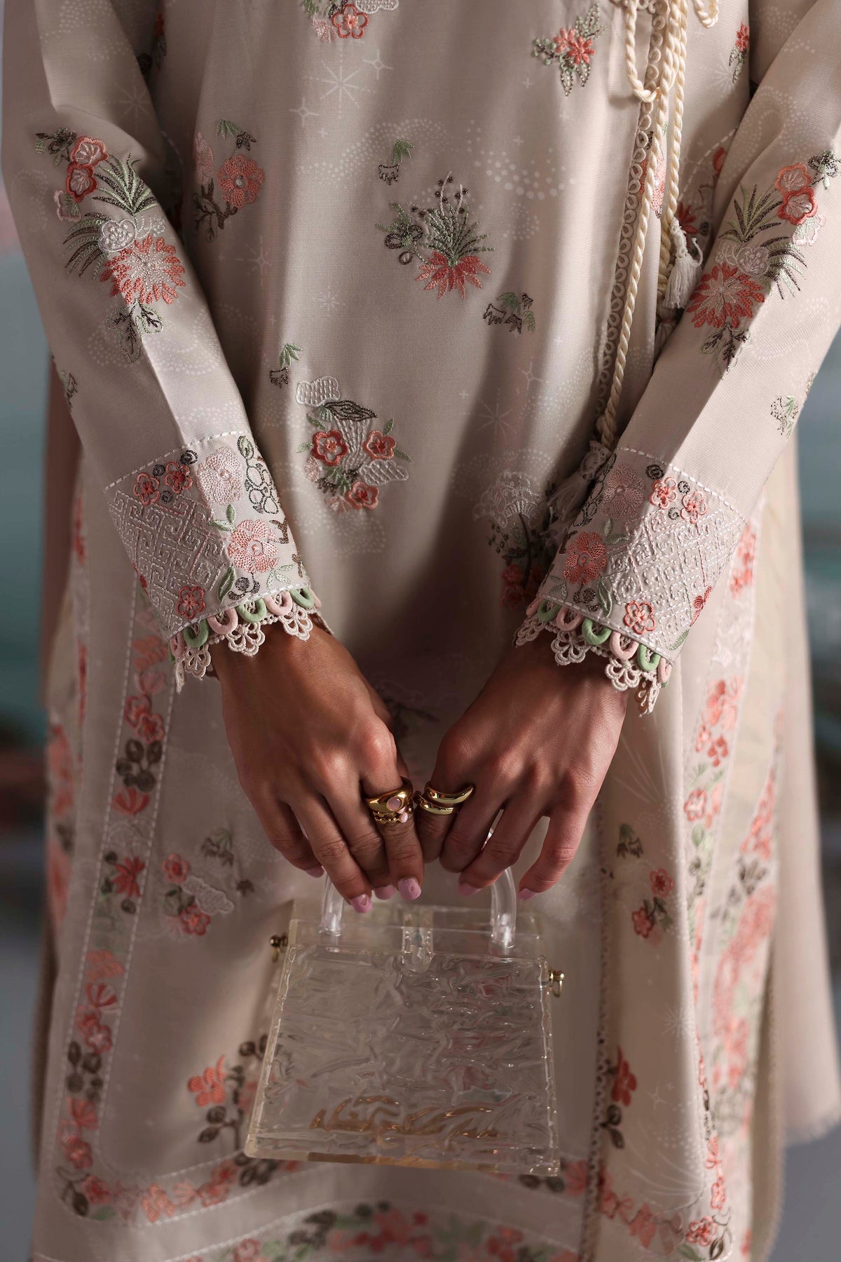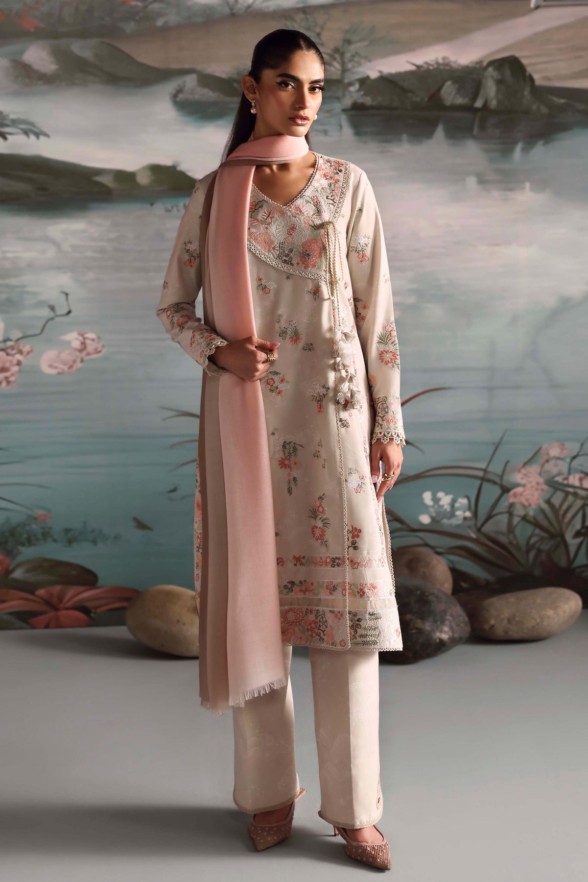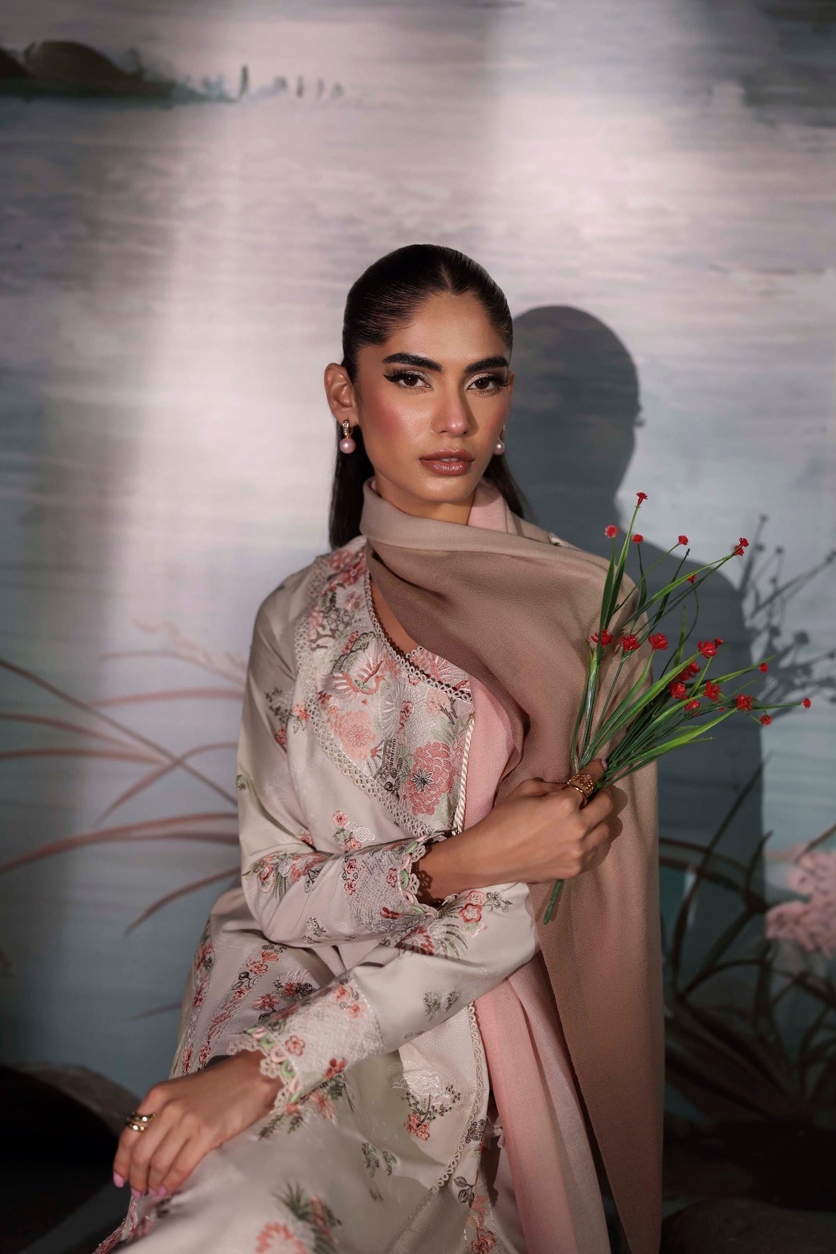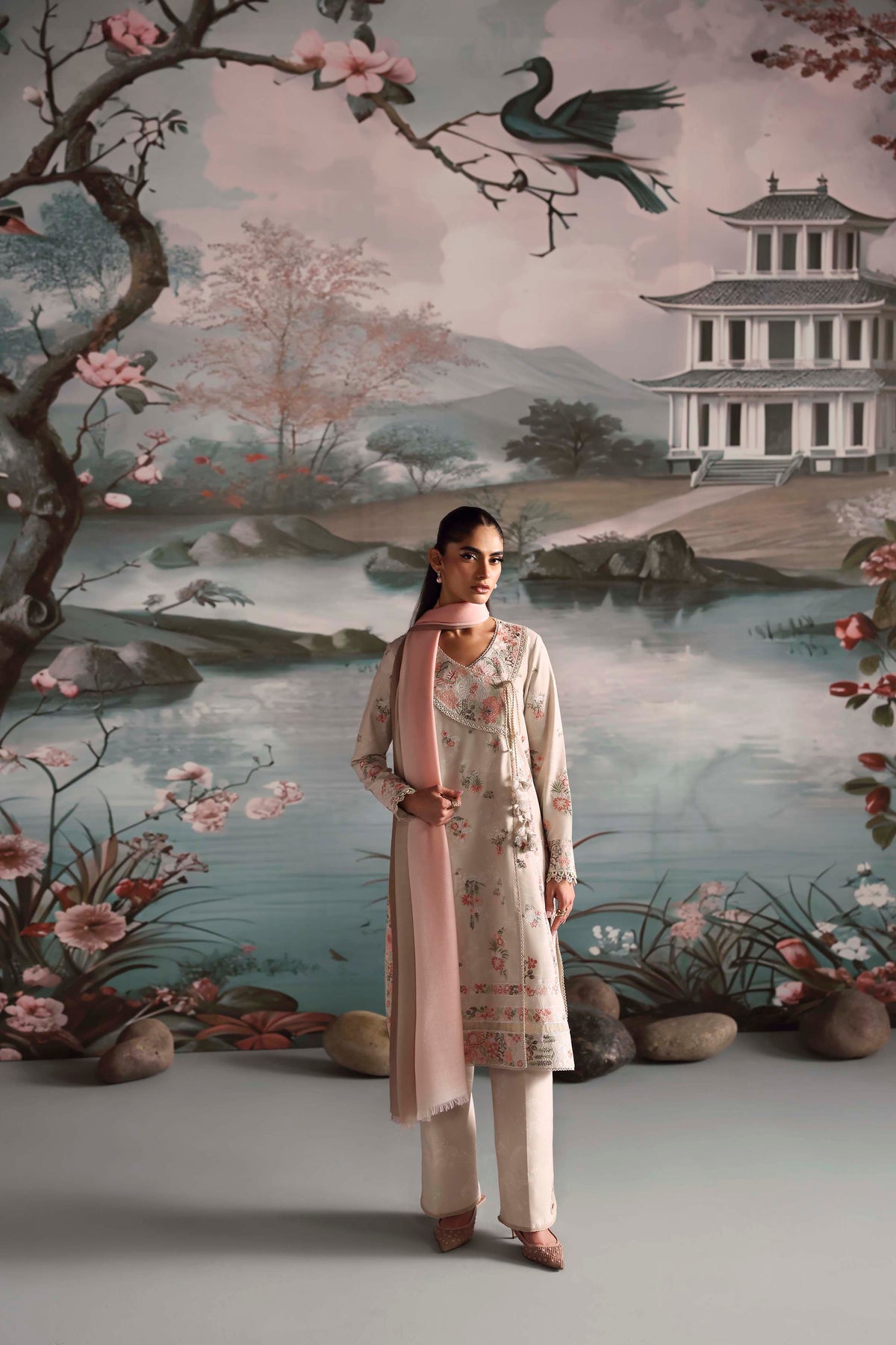 An elegant almond-colored thick silk outfit adorned with delicate blossom prints in beige, cream, and soft peach tones. Paired with an imported silk-wool scarf in soothing shades of peach and beige for a refined, timeless look. (Imported fabric)