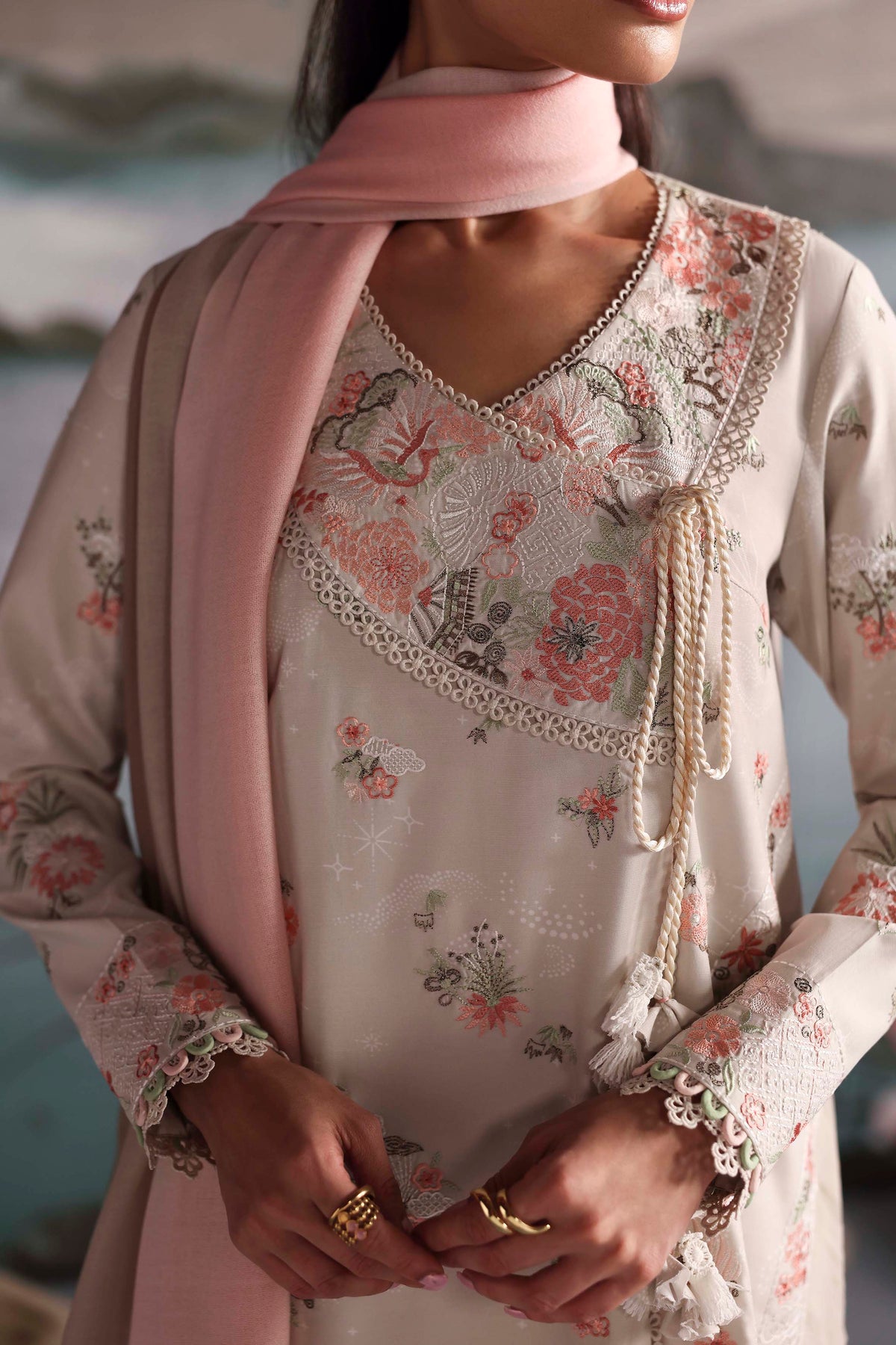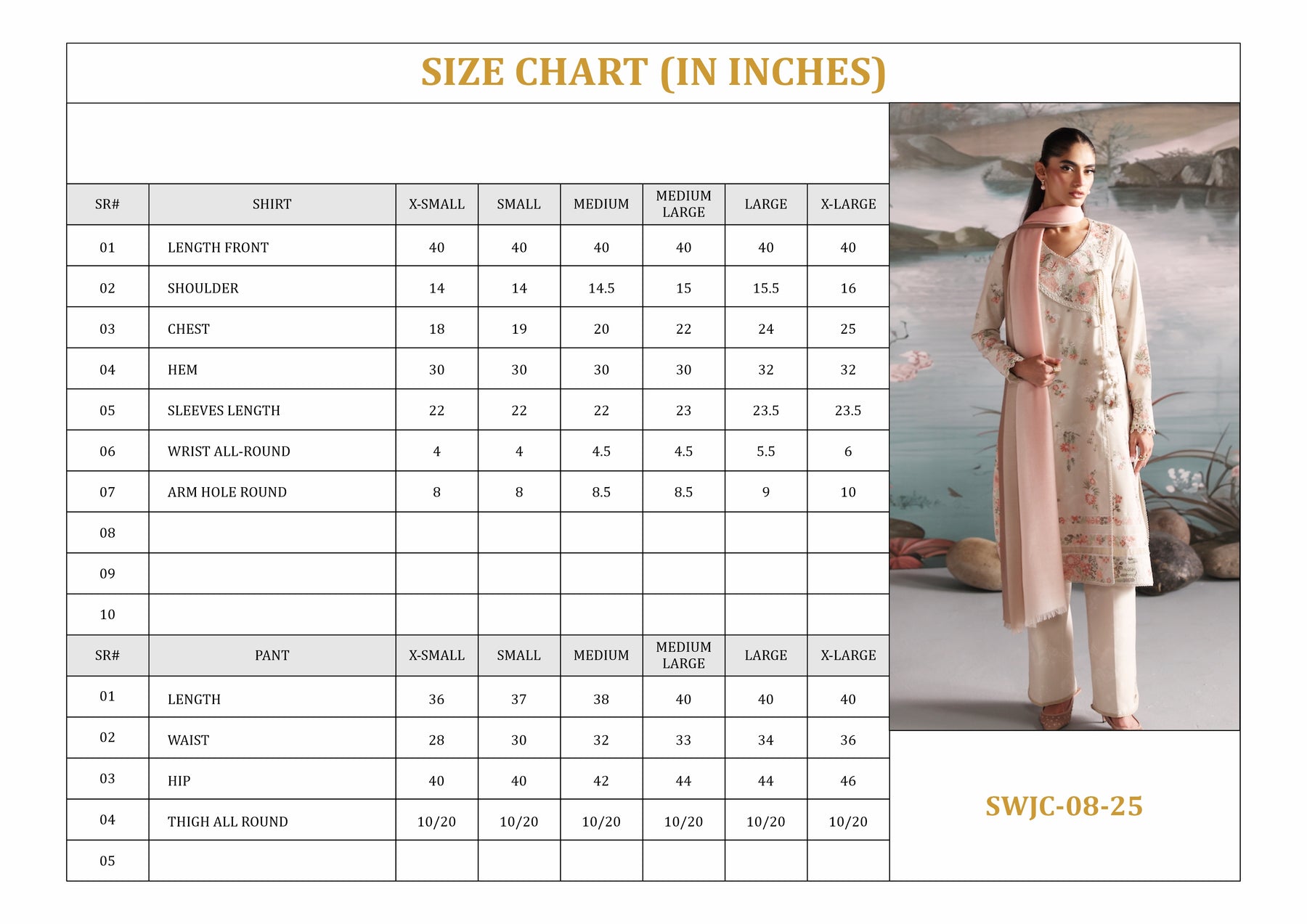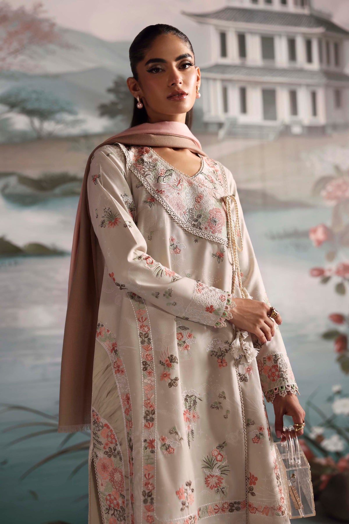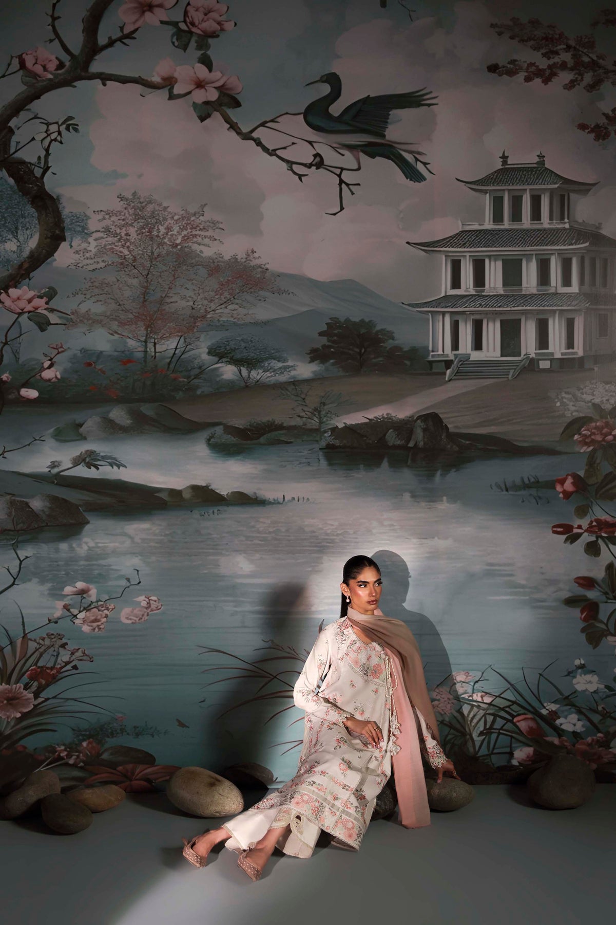 An elegant almond-colored thick silk outfit adorned with delicate blossom prints in beige, cream, and soft peach tones. Paired with an imported silk-wool scarf in soothing shades of peach and beige for a refined, timeless look. (Imported fabric)