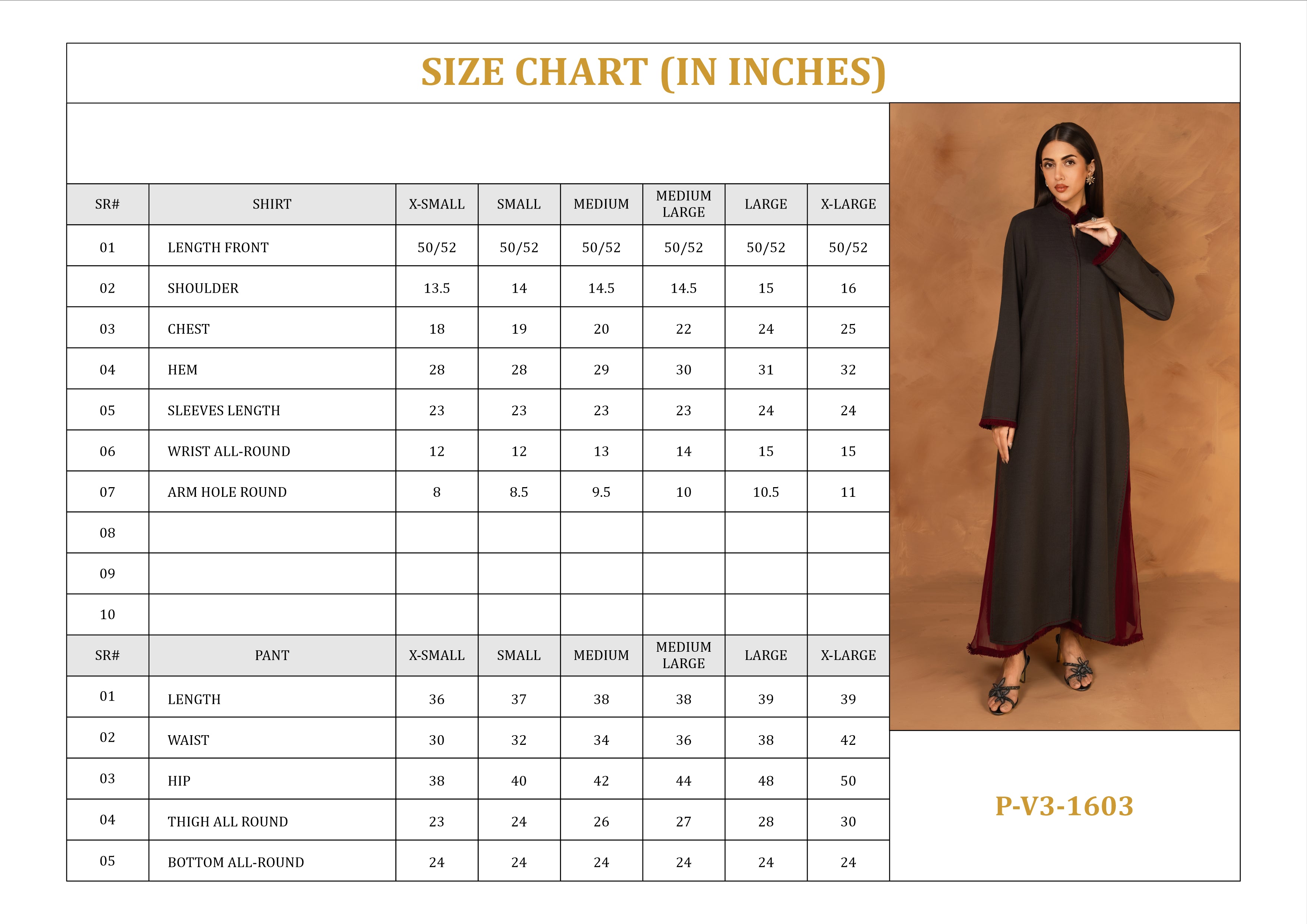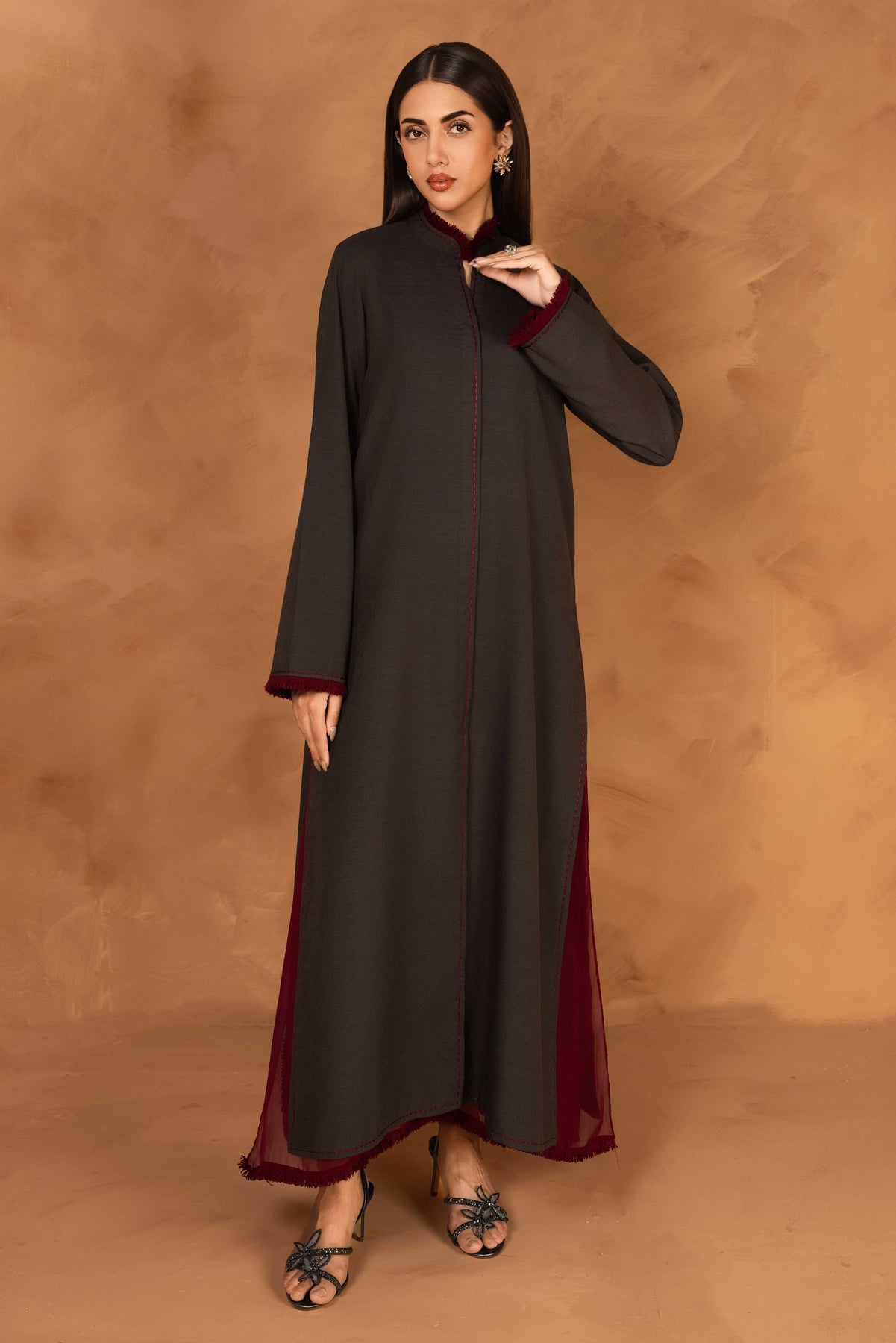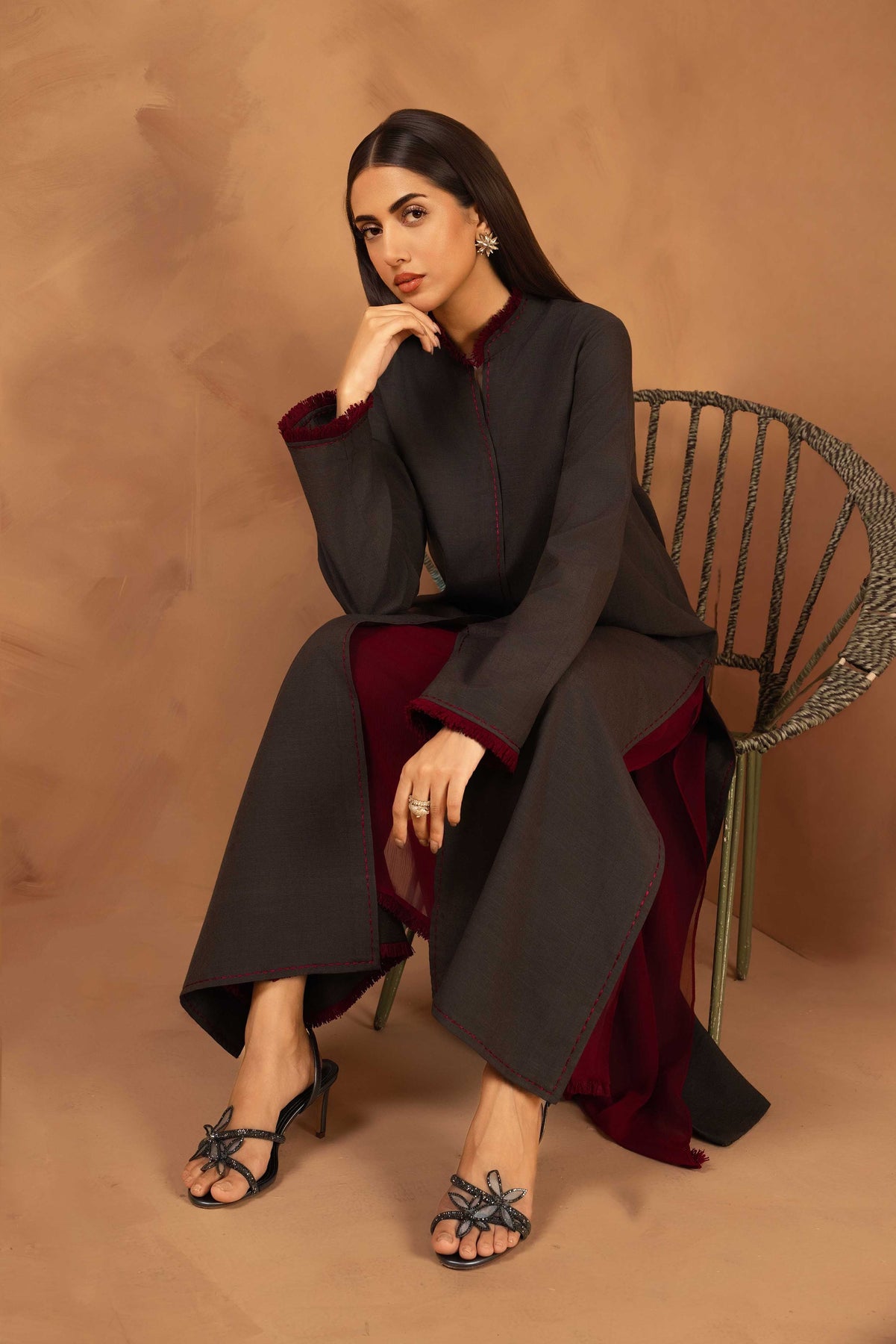 This striking chocolate brown Shirt is crafted from a thick winter fabric, offering warmth and an elegant drape. It features a sophisticated design with a stitched chiffon inner lining in a contrasting deep maroon that peeks out from the hem and side slits, beautifully complemented by plush maroon detailing on the collar and cuffs.