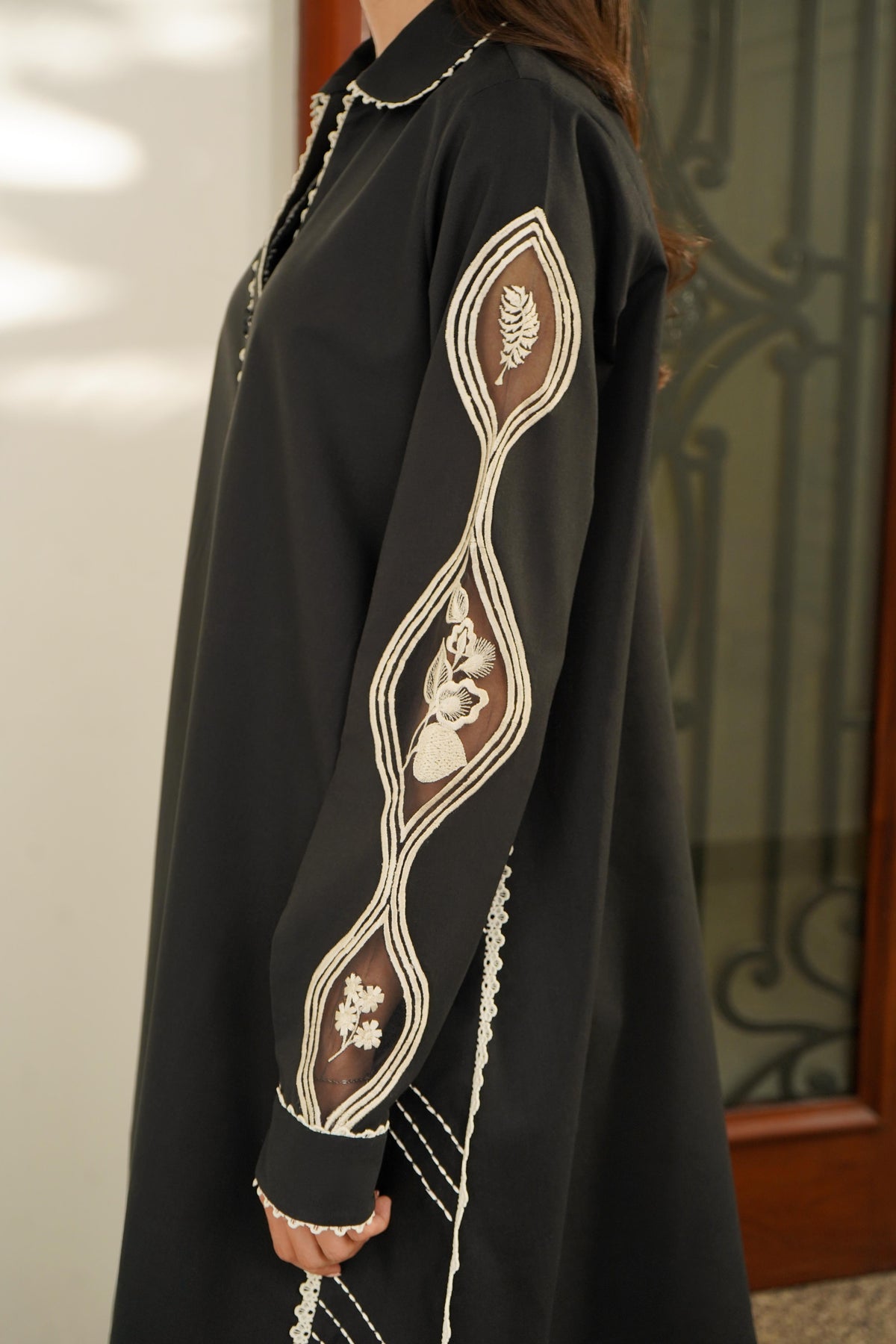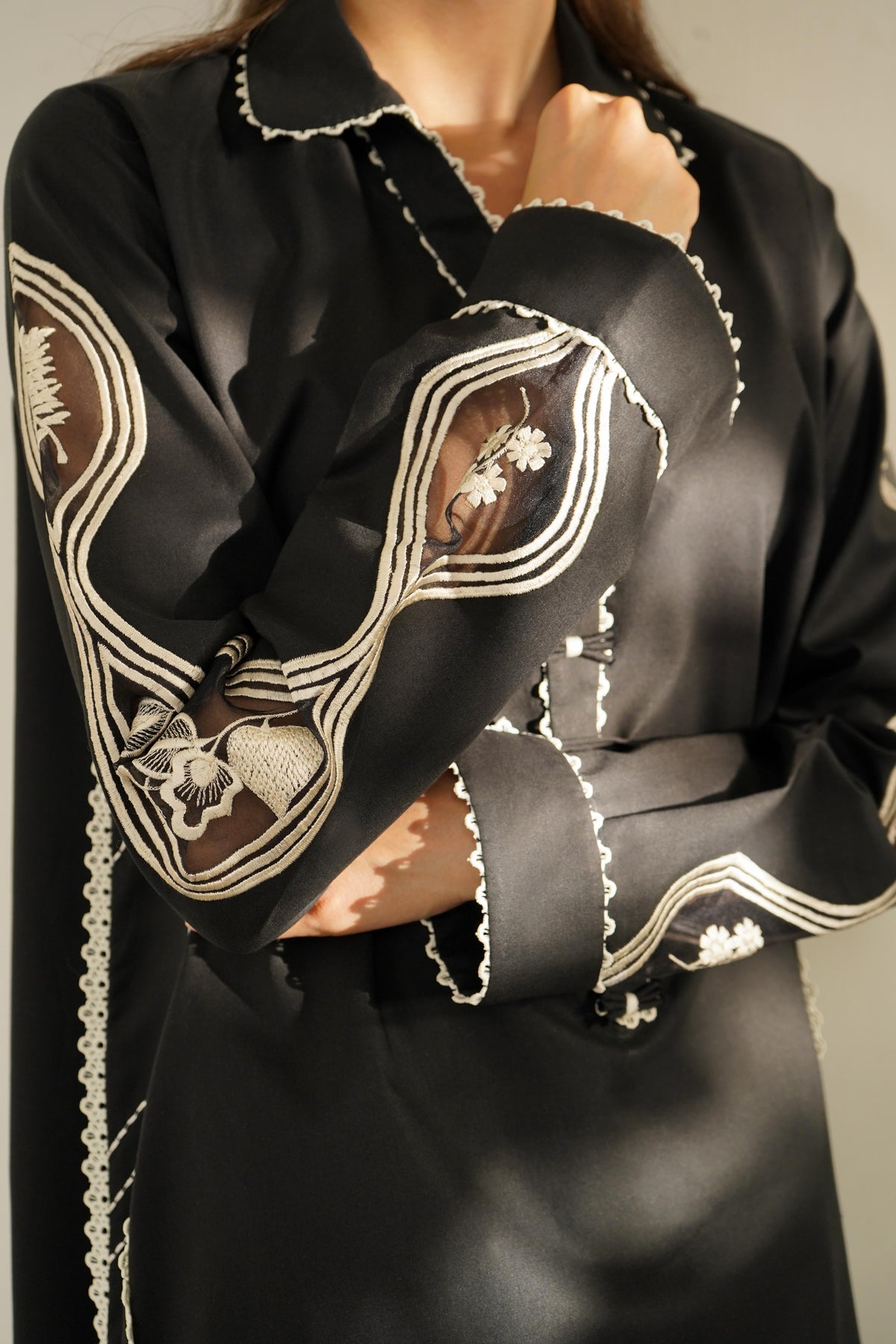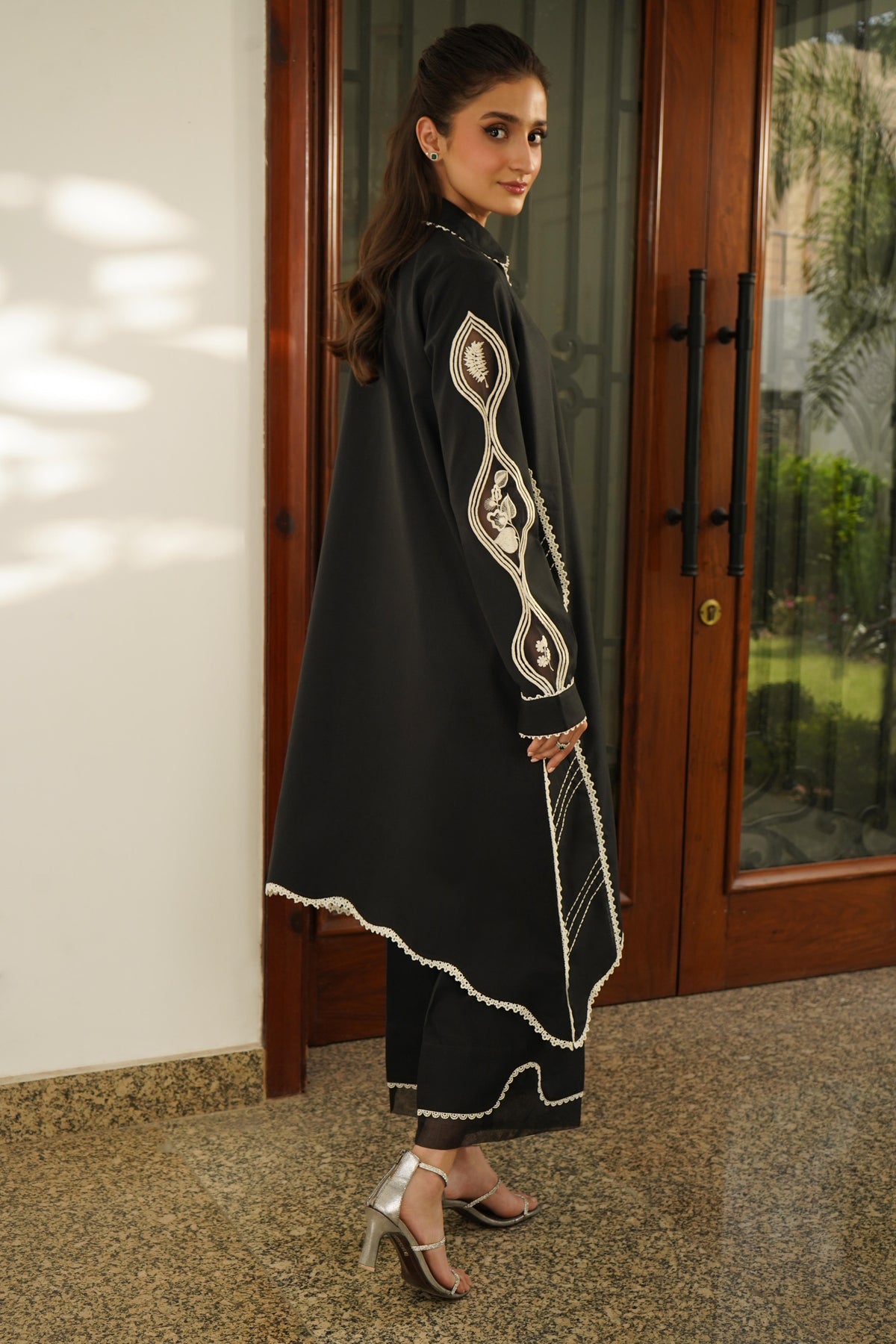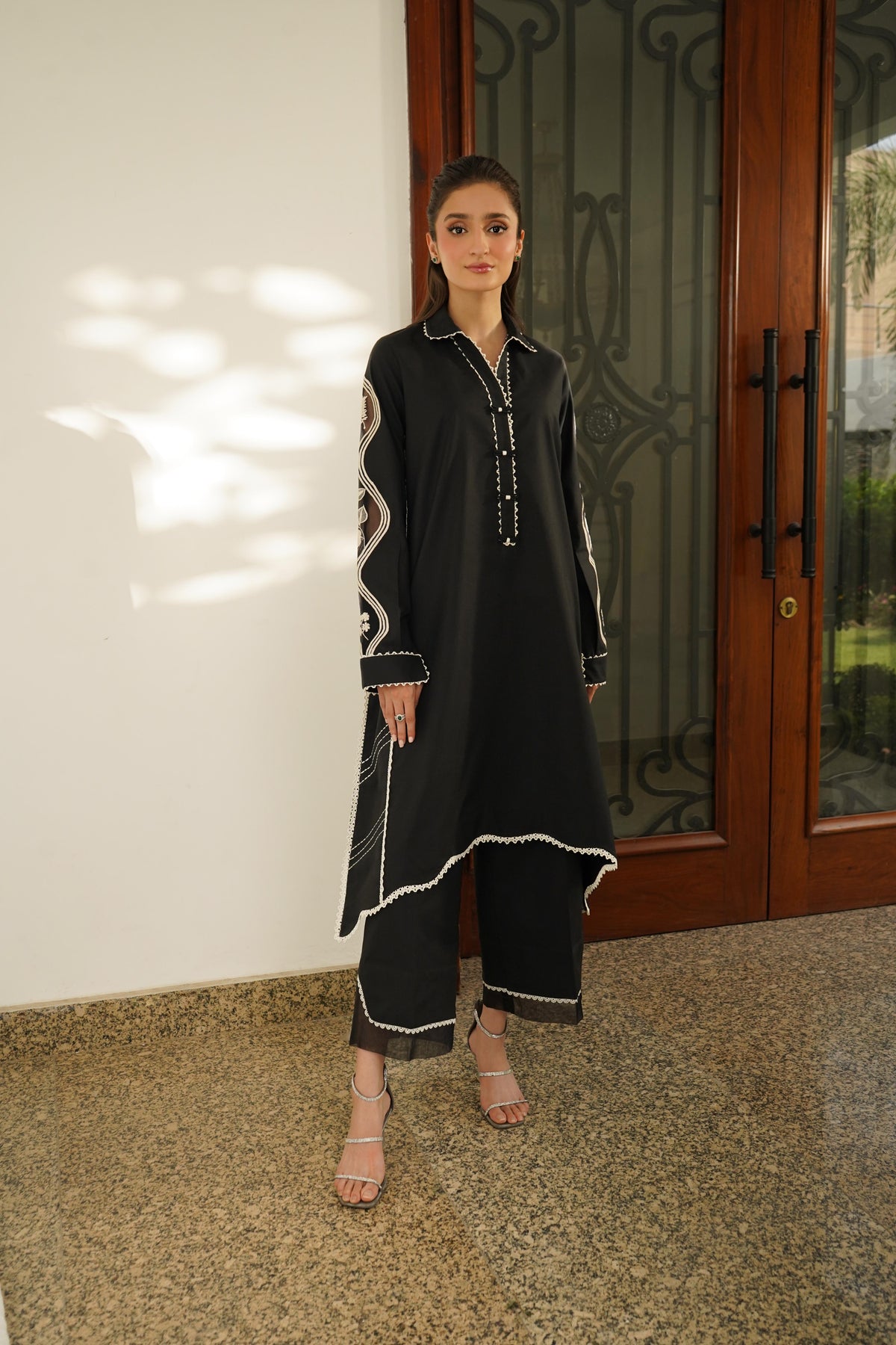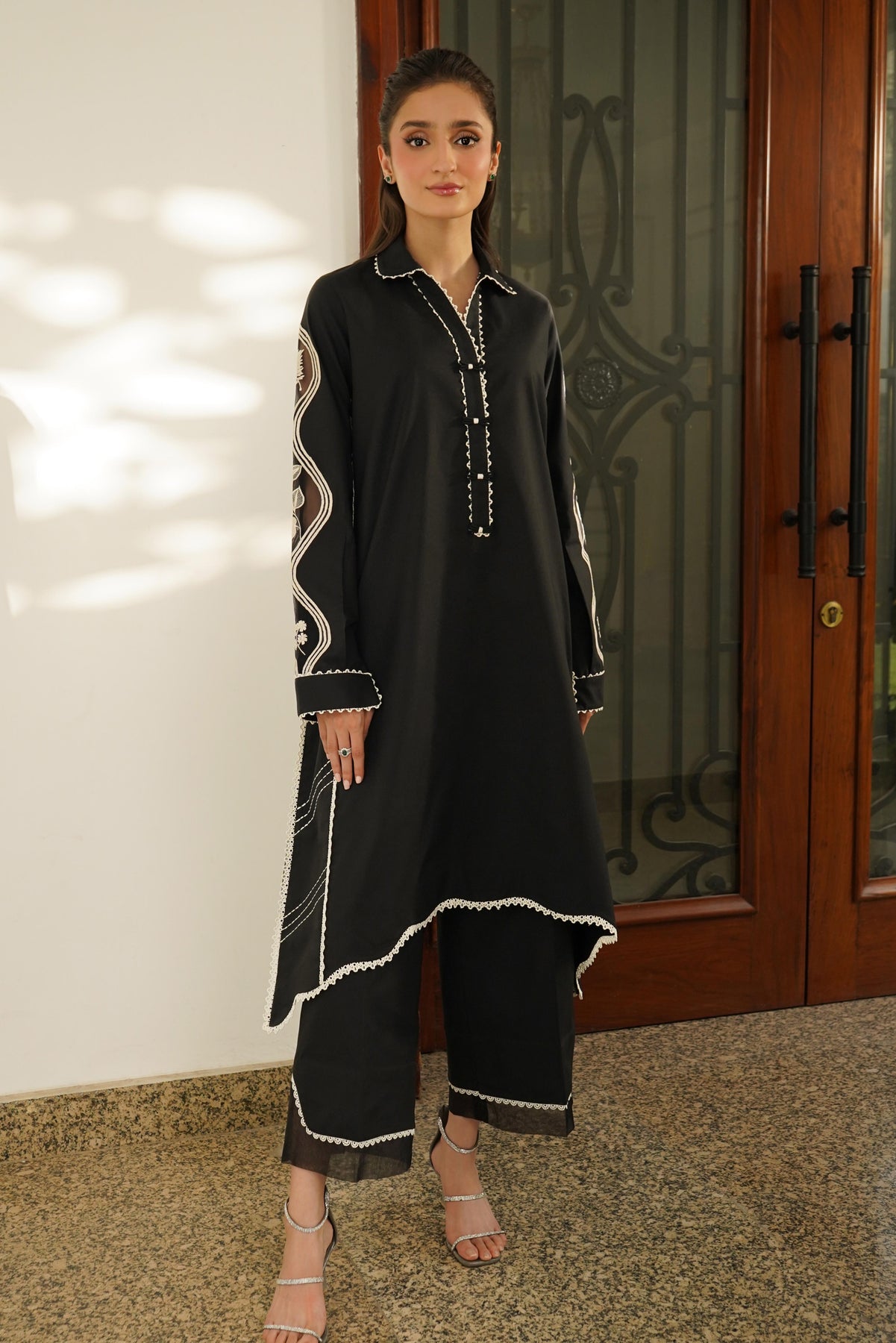 This elegant 2-piece black attire (Shirt & Pant) is crafted in premium Pima cotton, featuring embroidered sleeves with organza patchwork. Delicate stitching on the neckline and side panels adds a refined, graceful touch.