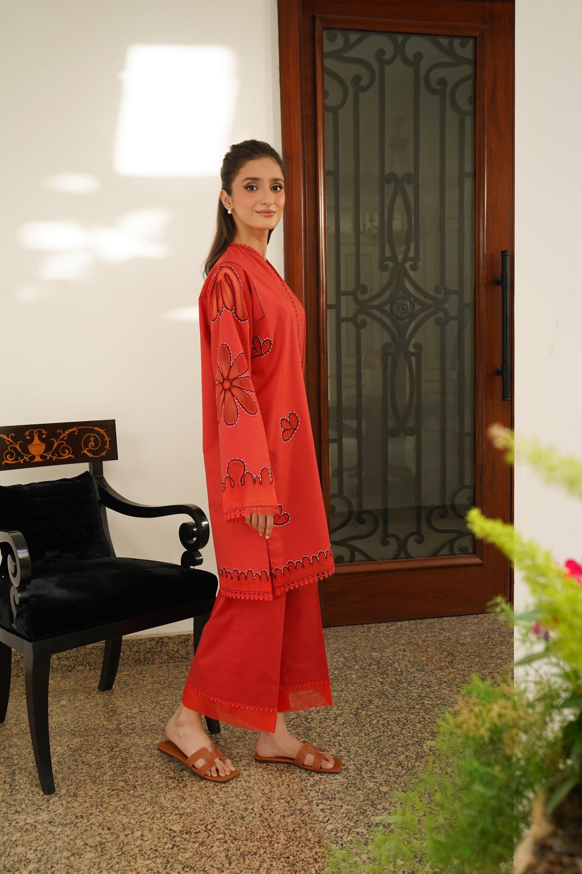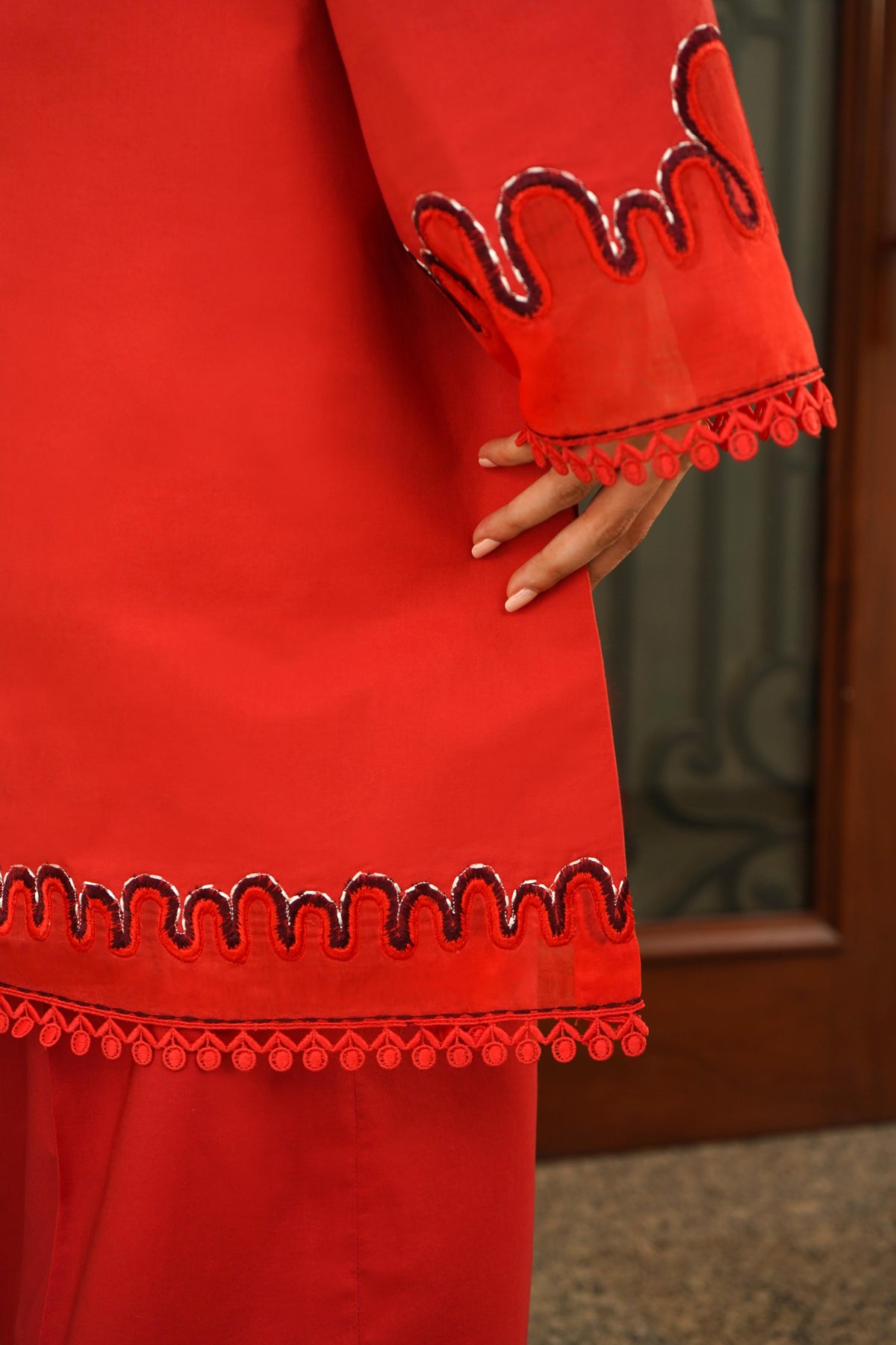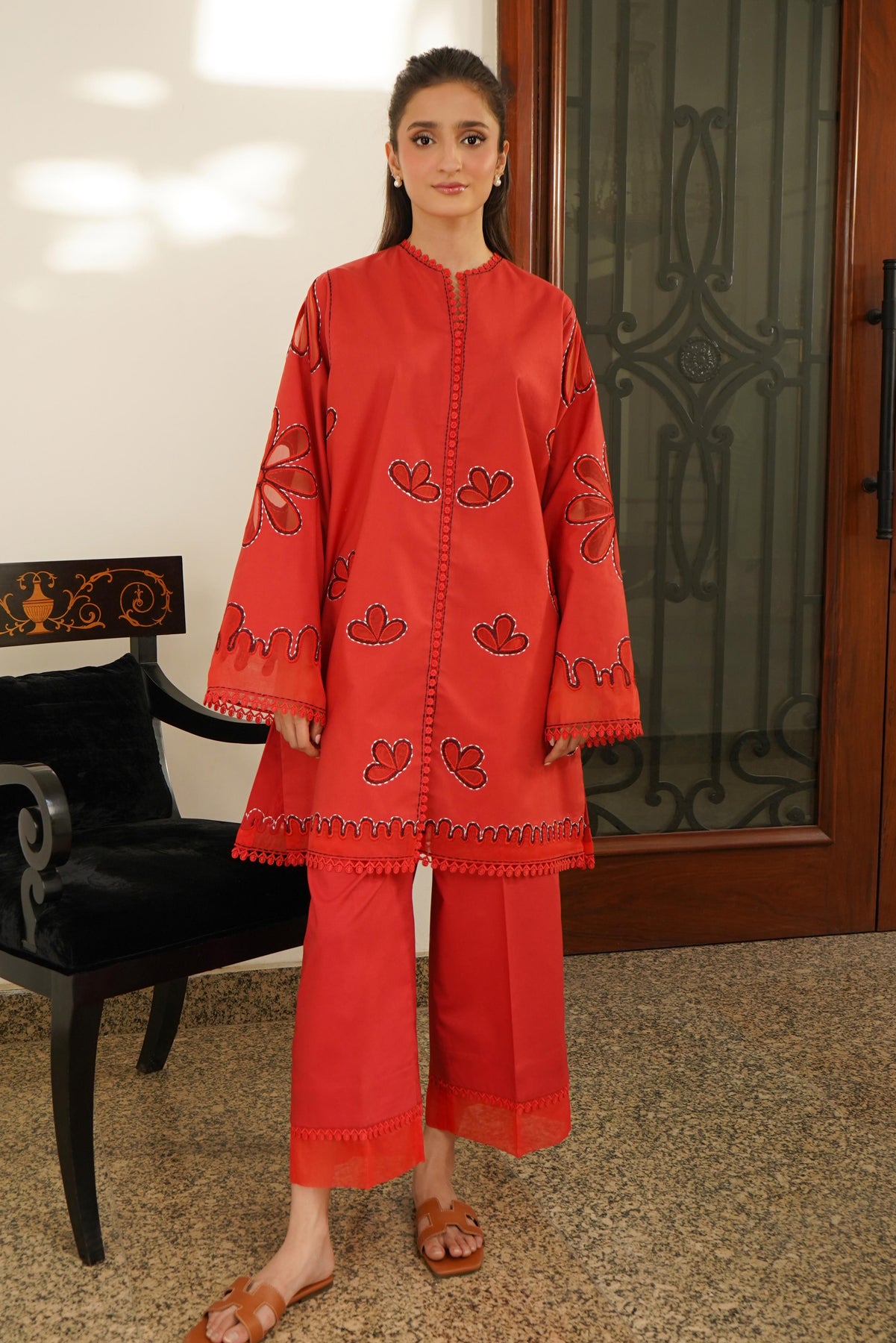 This 2-piece red attire (Shirt & Pant) is crafted in premium Pima cotton. Featuring all-over laser-cut embroidery on the shirt’s front, sleeves, and daman, enhanced with delicate cotton laces on the neckline, front, sleeves, daman, and pants for an extra touch of elegance.