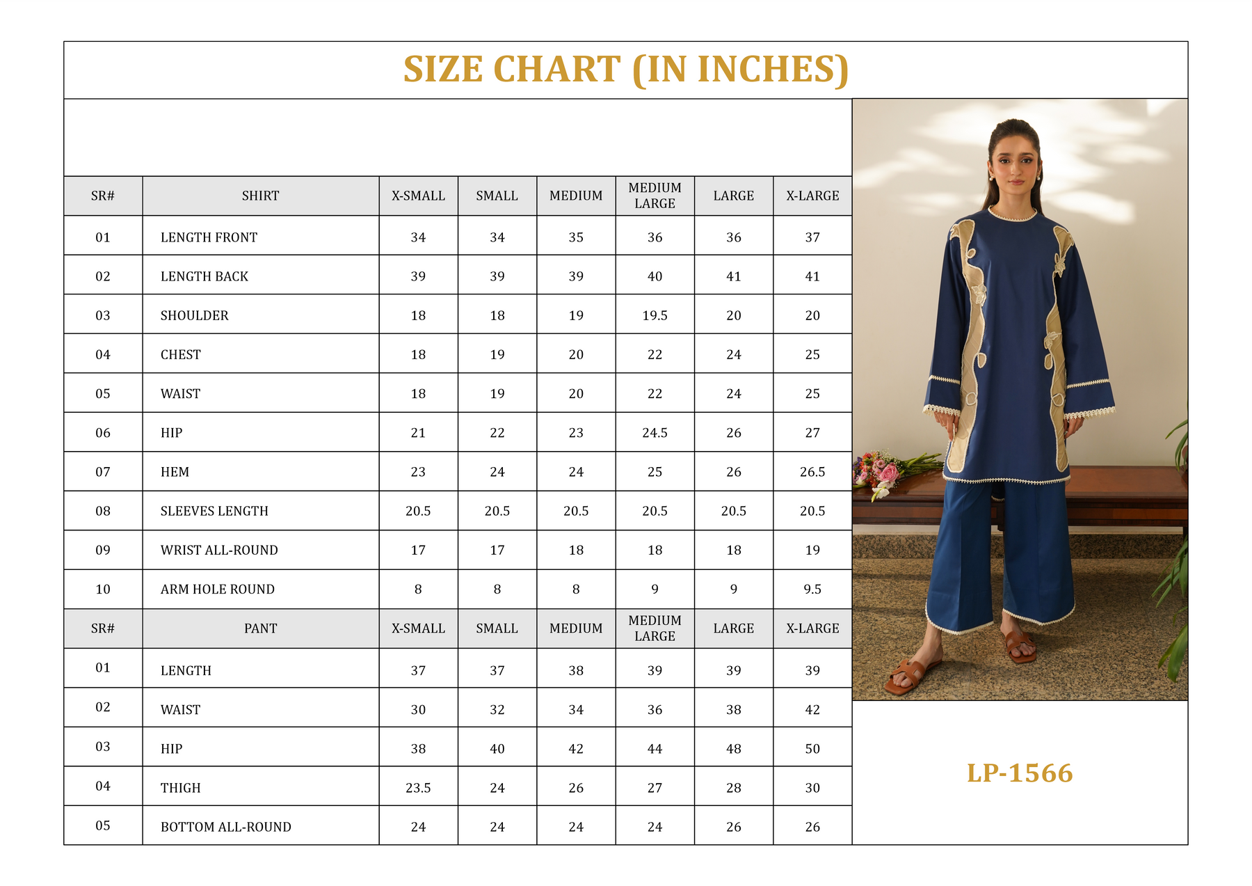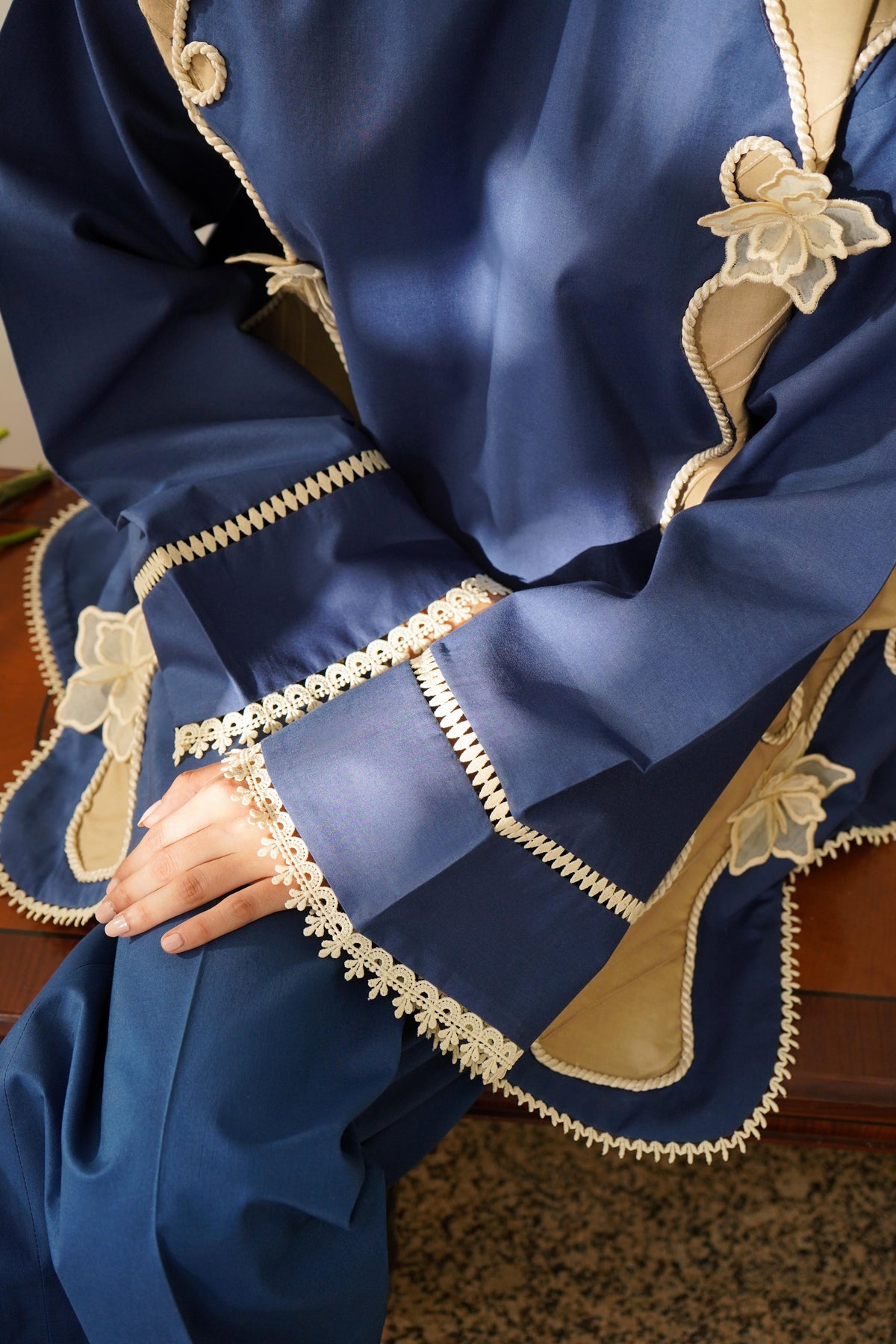 From our Summer Pret Collection This elegant 2-piece attire (Shirt & Pant) Crafted in rich navy blue premium cotton, this elegant 2-piece suit features a tasteful fusion of timeless grace and modern detail. The shirt is beautifully accented with pretty handmade 3D flowers, delicately arranged over a beige pintucked panel, adding dimension and charm. The panel is further outlined with fine hand-crafted dori work.
