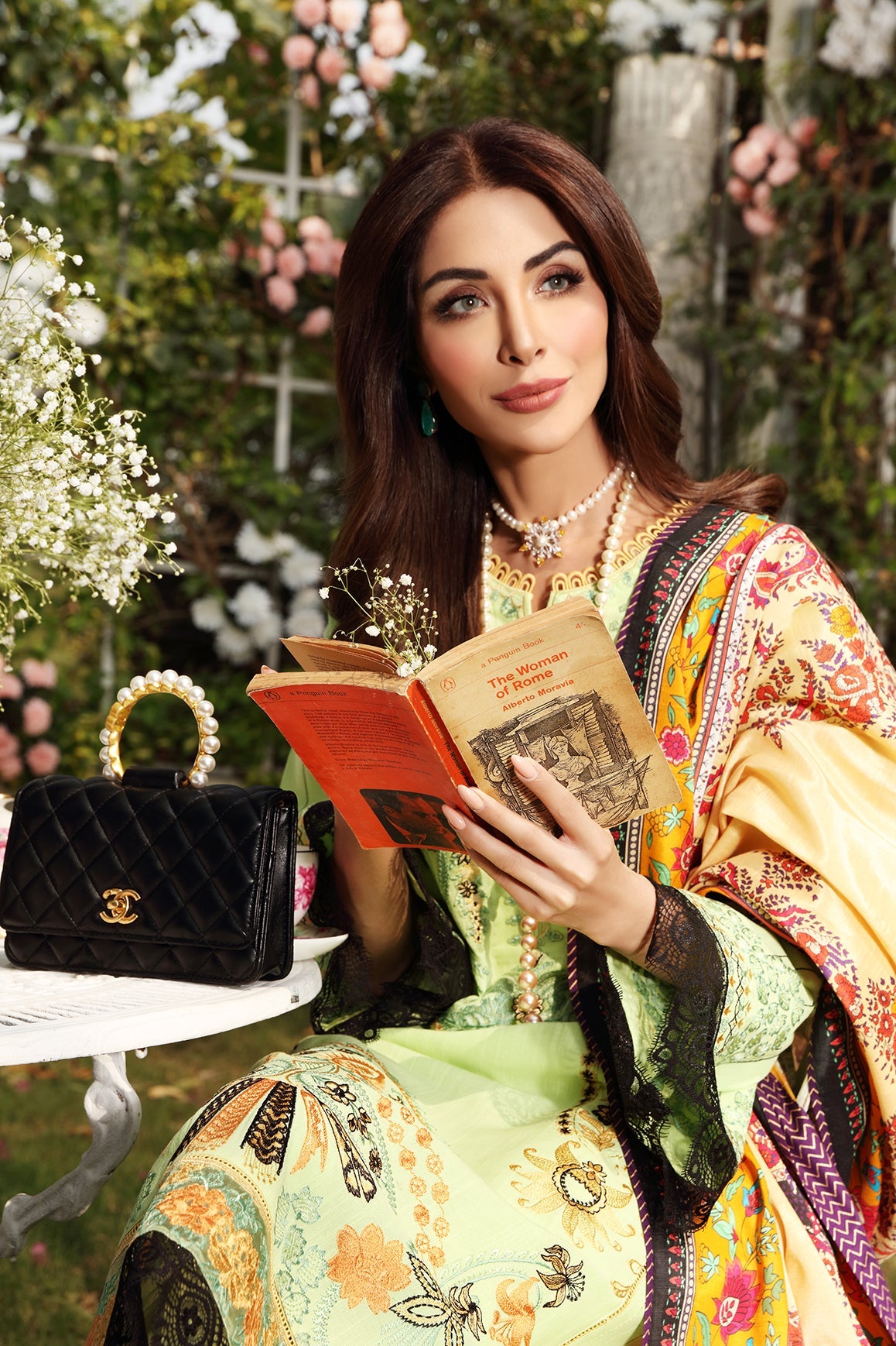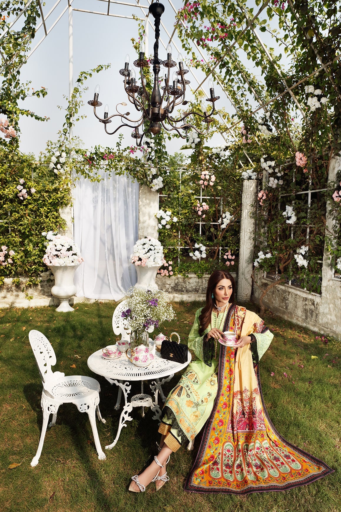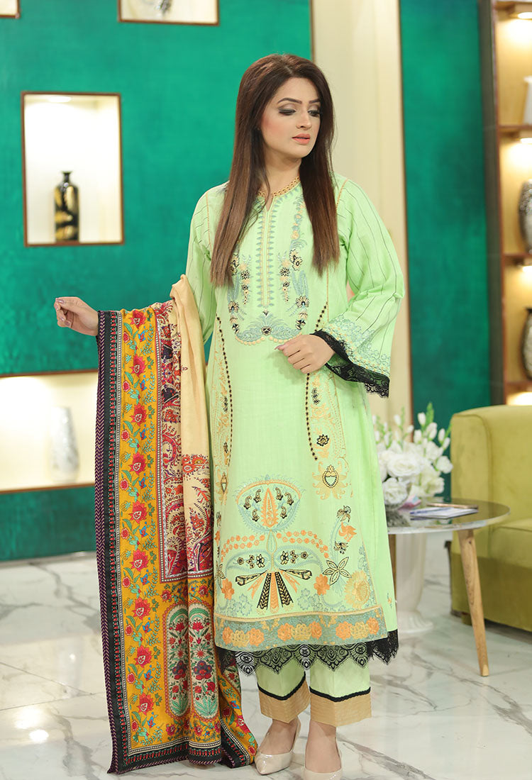 Put your best foot forward in this unique green fully embroidered karandi shirt with necklines, sleeves and daaman details. The gorgeous raw silk contrasting dupatta holds its own with its stunning combination of colours. The suit also features cotton trousers.
