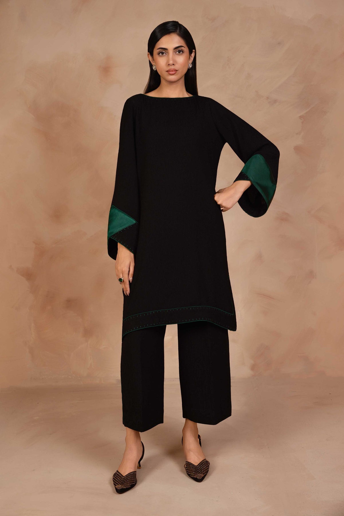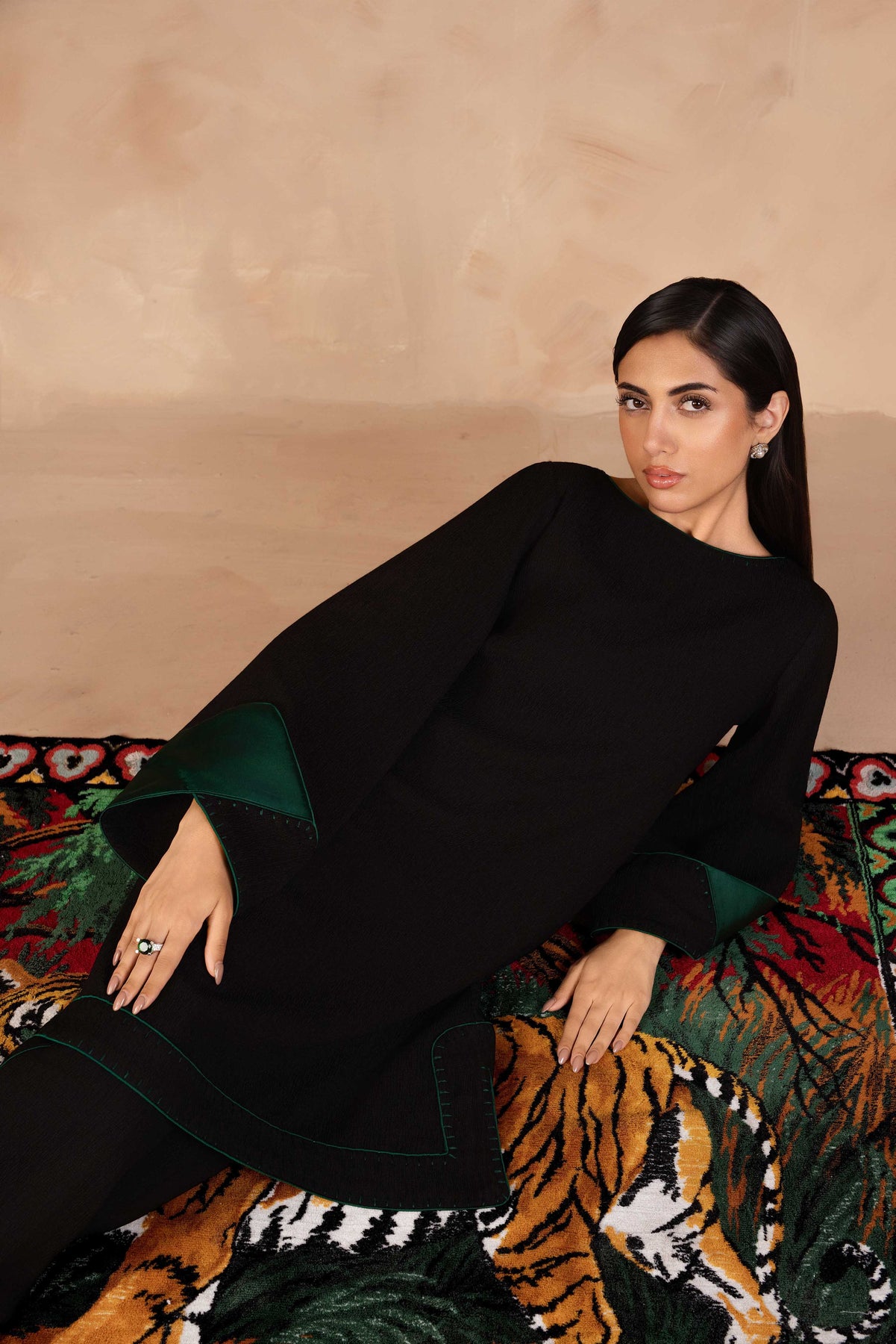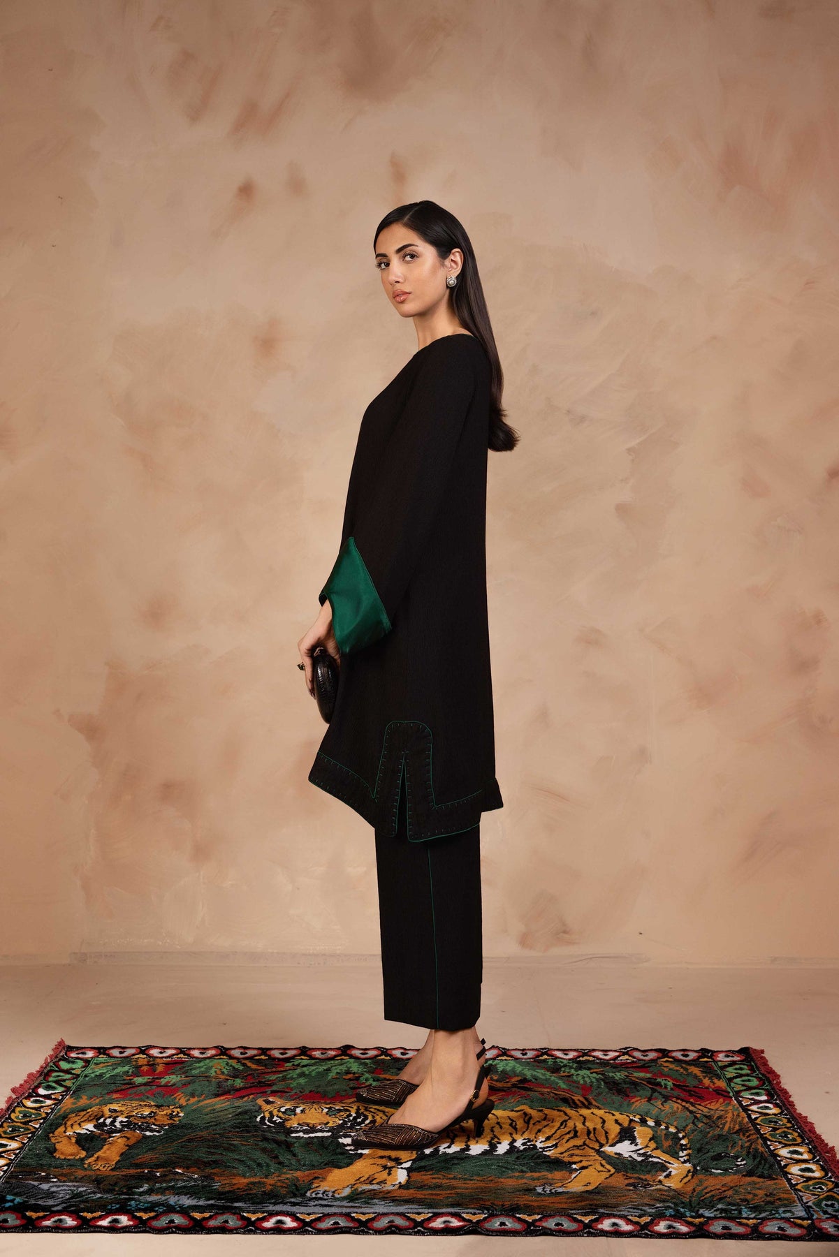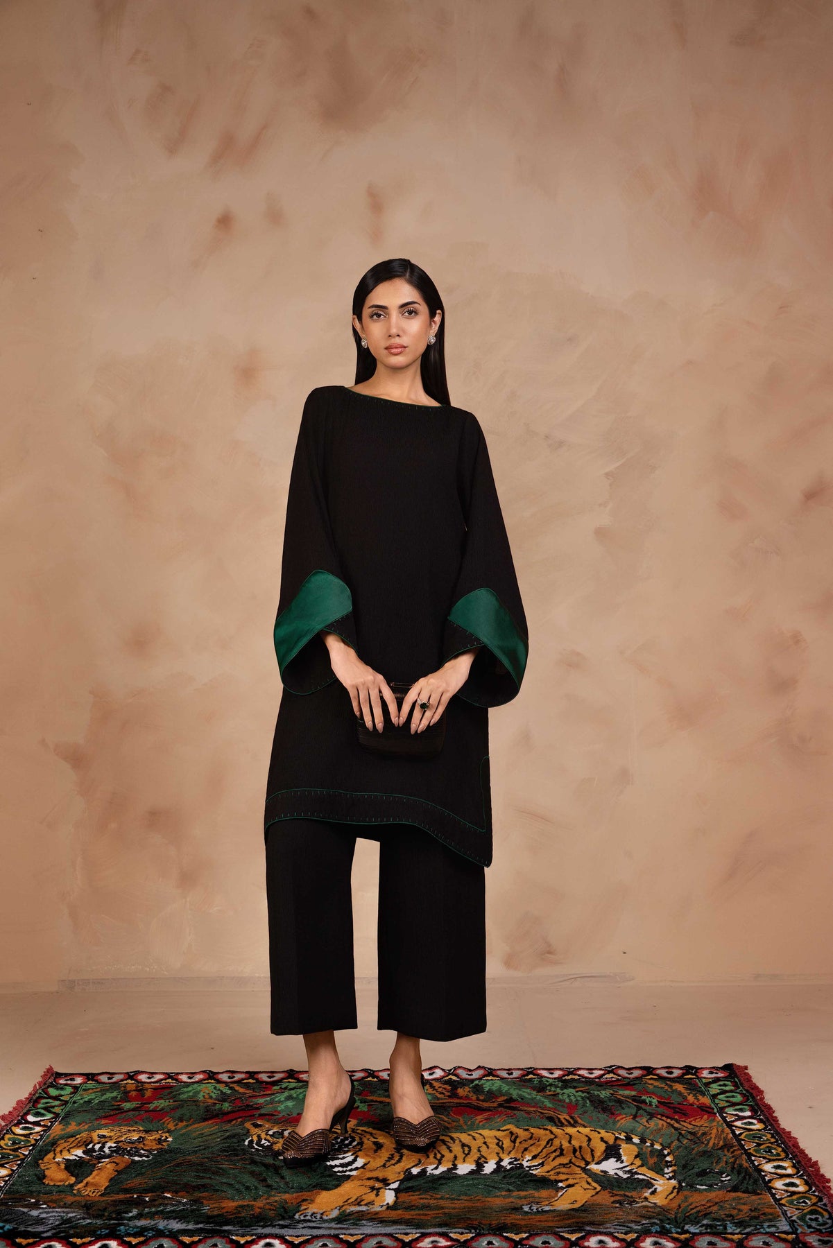 This elegant black ensemble, fashioned from crush-effect winter silk, offers a textural richness perfect for cooler weather. The boat-neck tunic features chic, flared cuffs with a vibrant emerald green lining, complemented by subtle green threadwork at the hem.