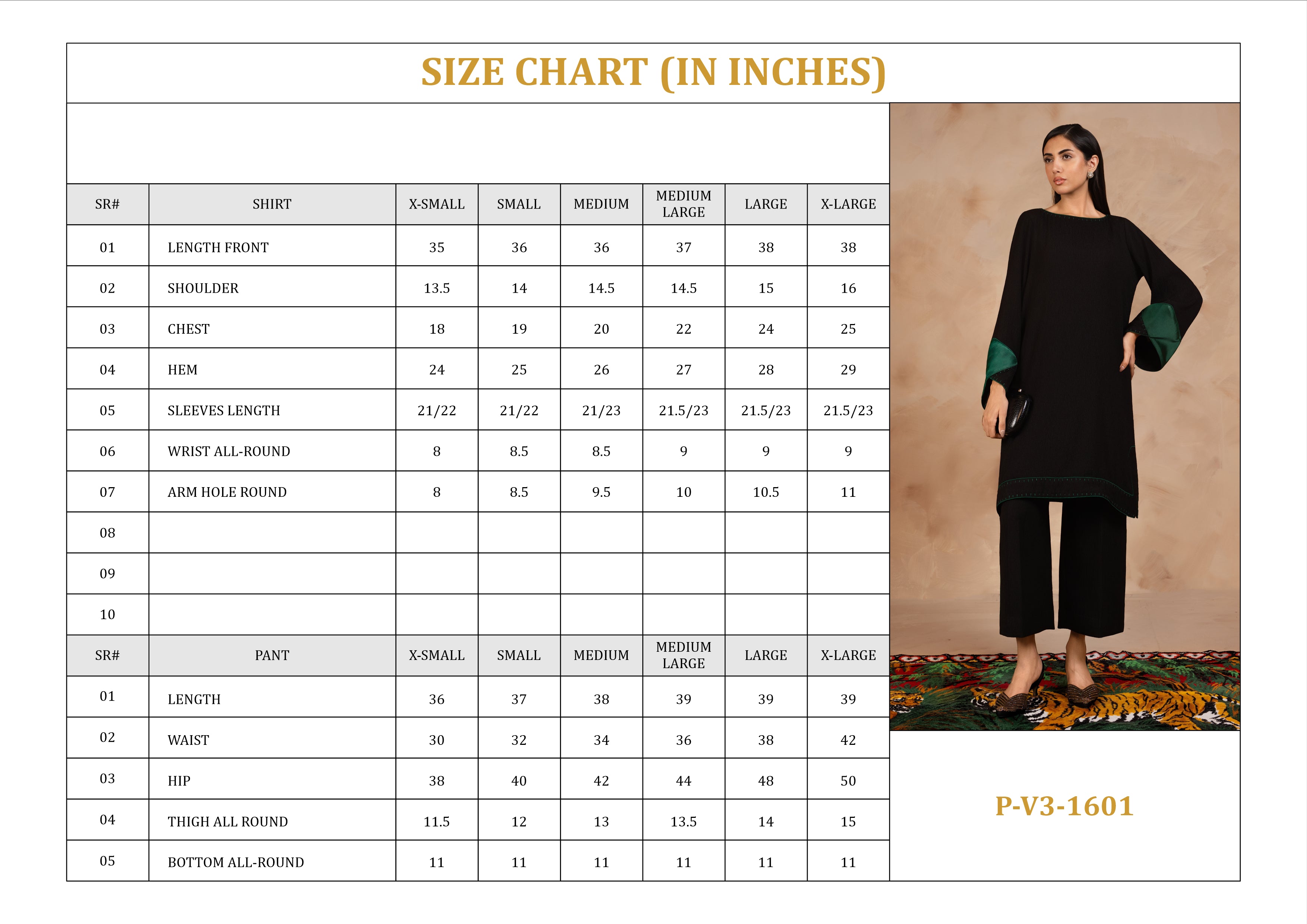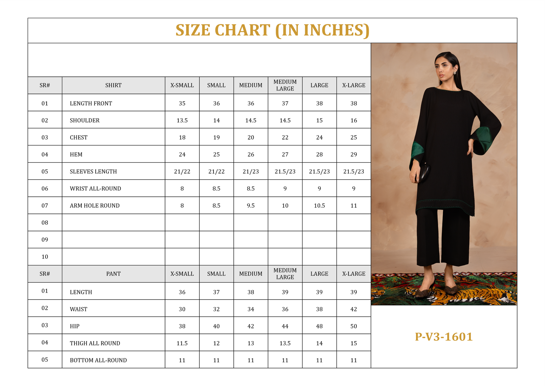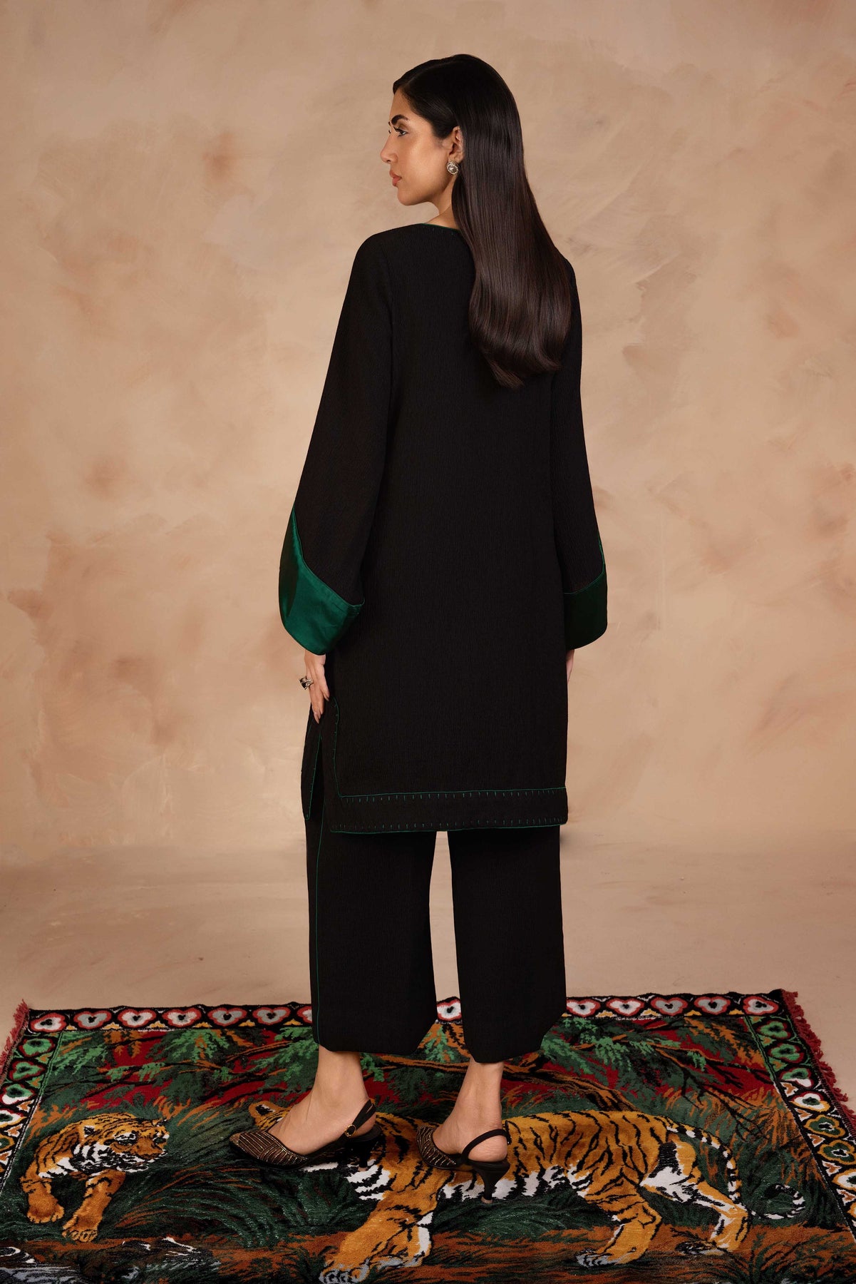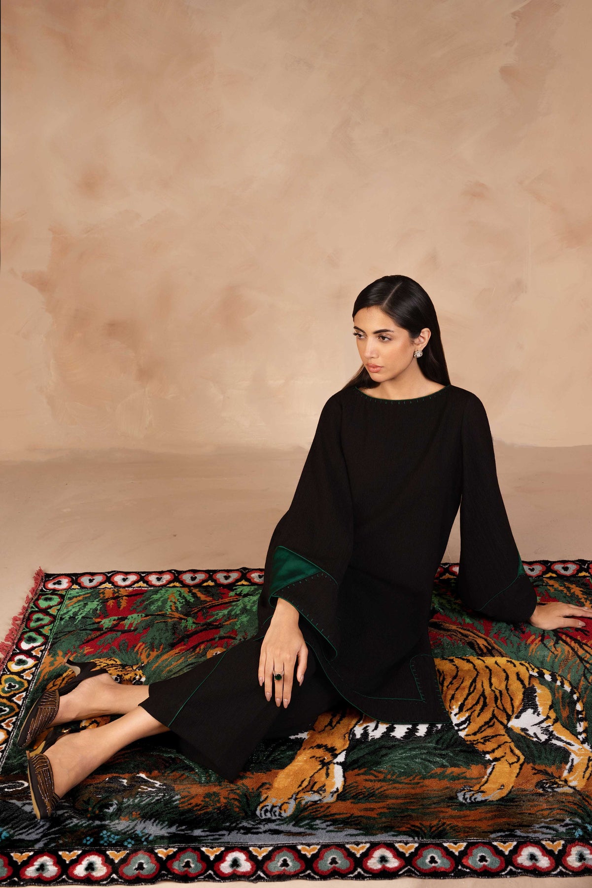 This elegant black ensemble, fashioned from crush-effect winter silk, offers a textural richness perfect for cooler weather. The boat-neck tunic features chic, flared cuffs with a vibrant emerald green lining, complemented by subtle green threadwork at the hem.