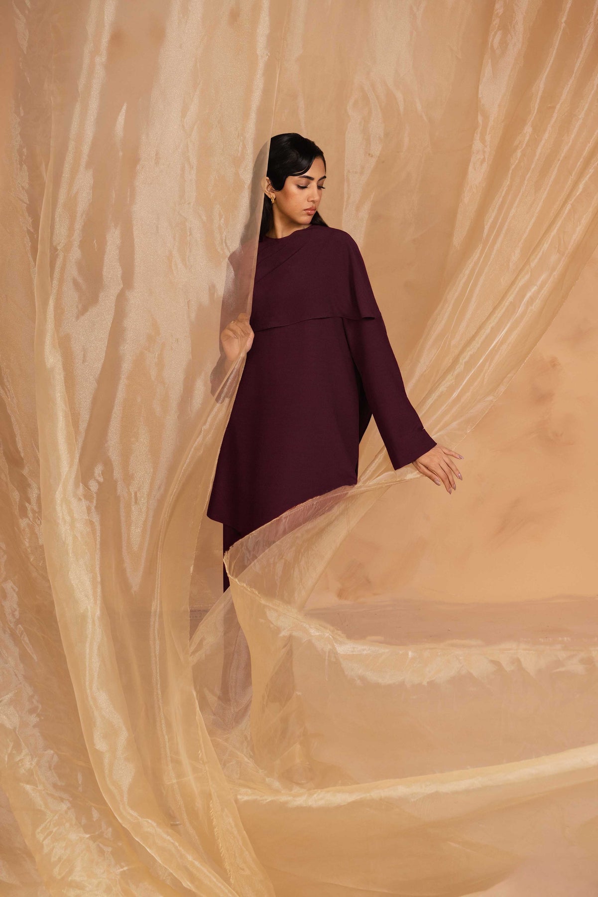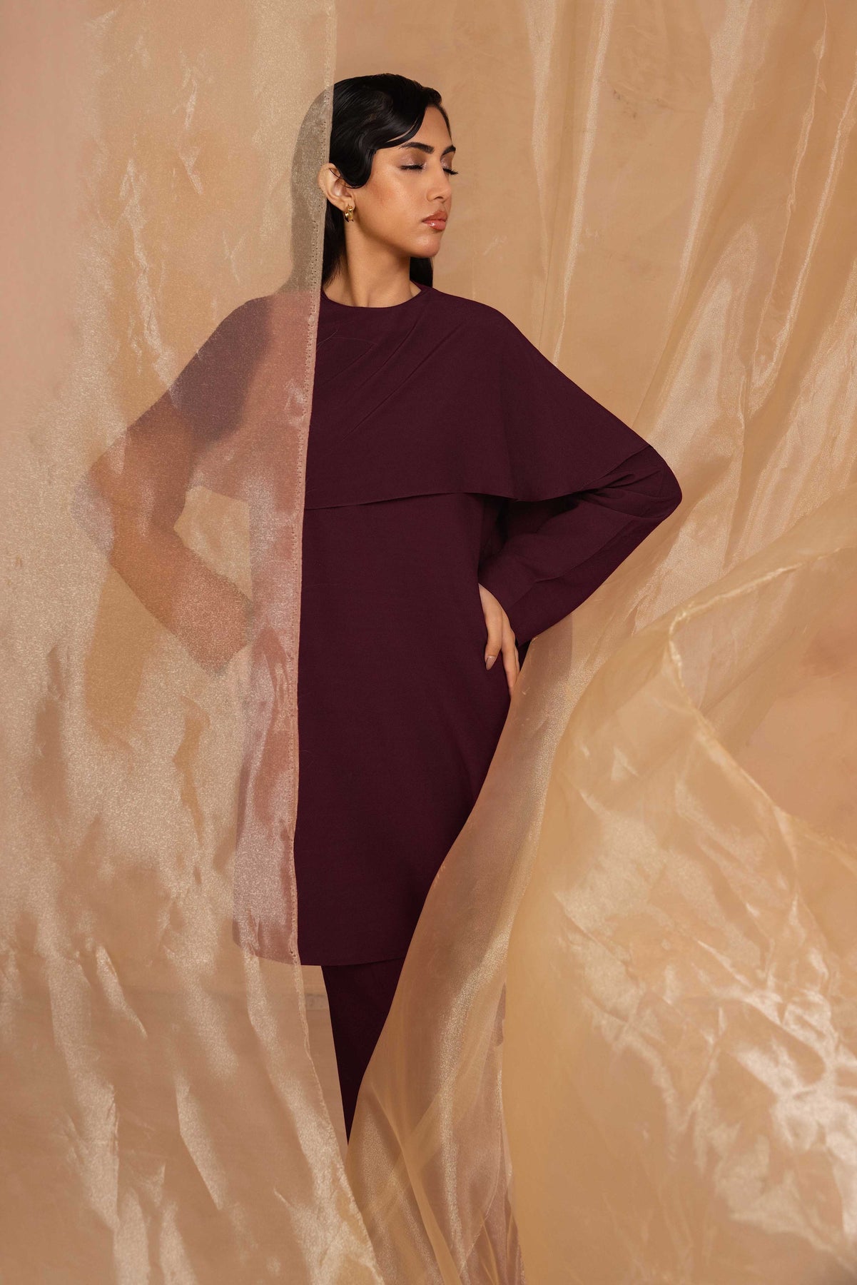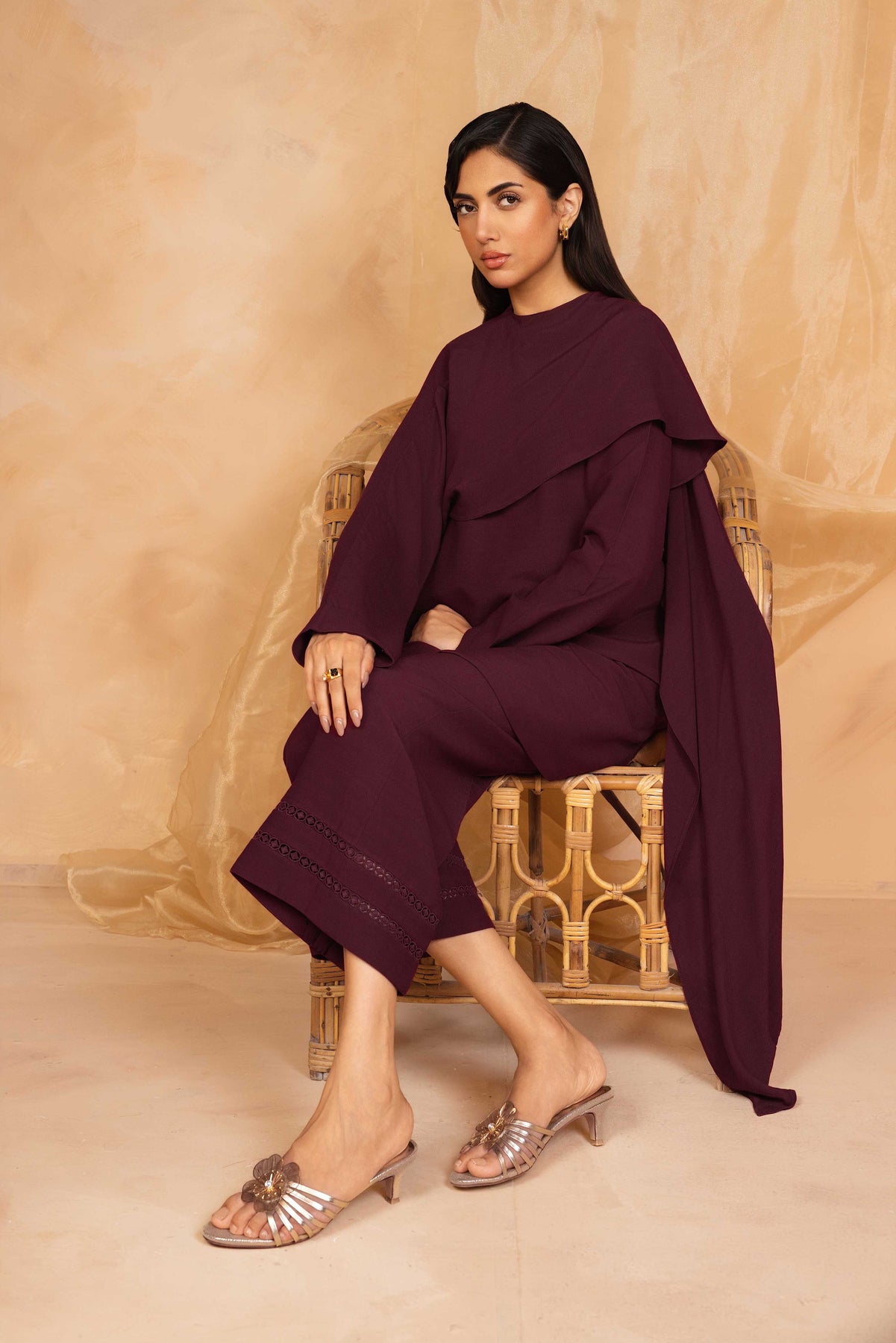 This contemporary ensemble, fashioned from pure viscose crepe, drapes beautifully in a rich, solid maroon hue. The relaxed tunic is elevated by a dramatic cape-style overlay, while the coordinating trousers feature a delicate, contrasting lace detail at the hem.