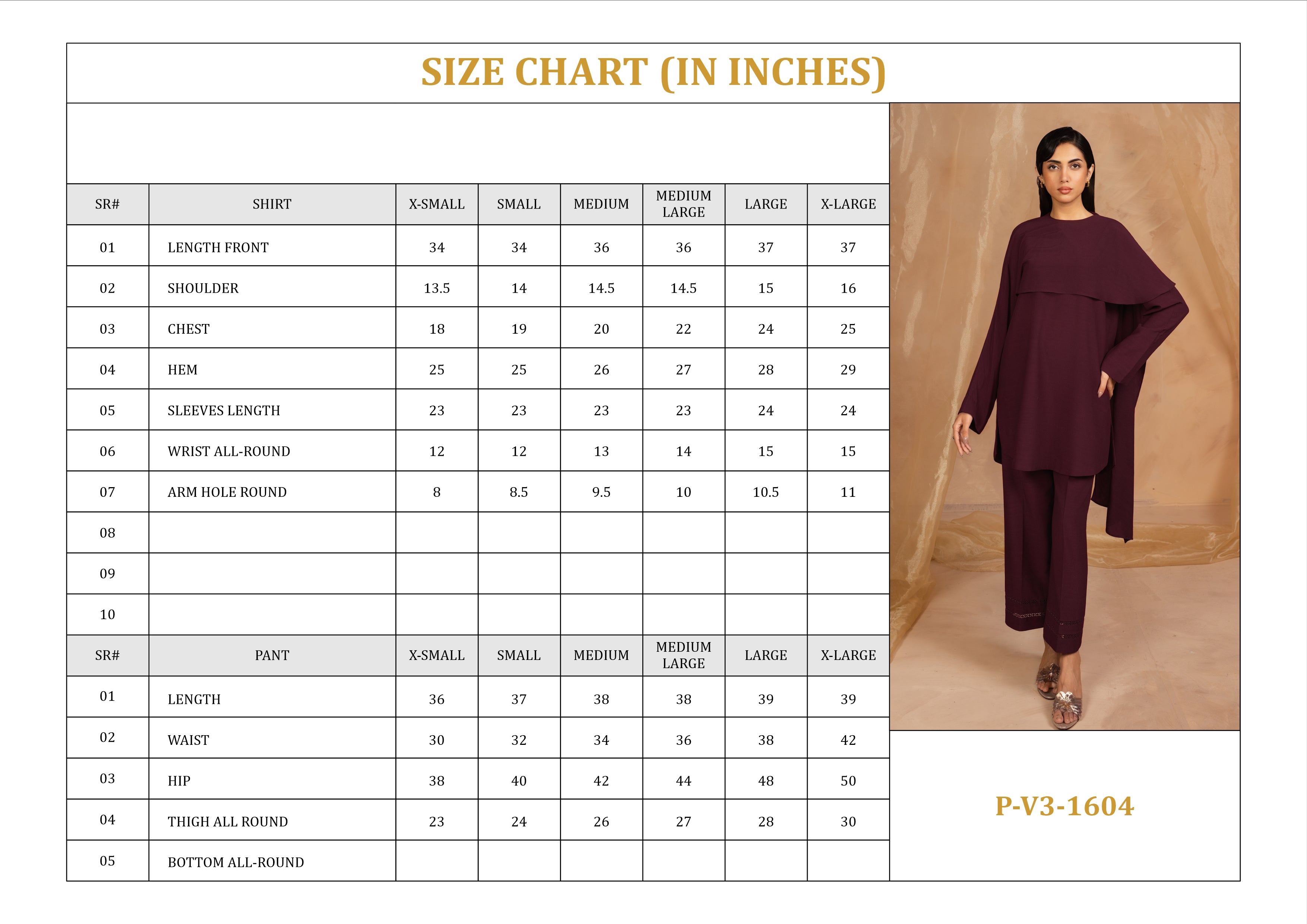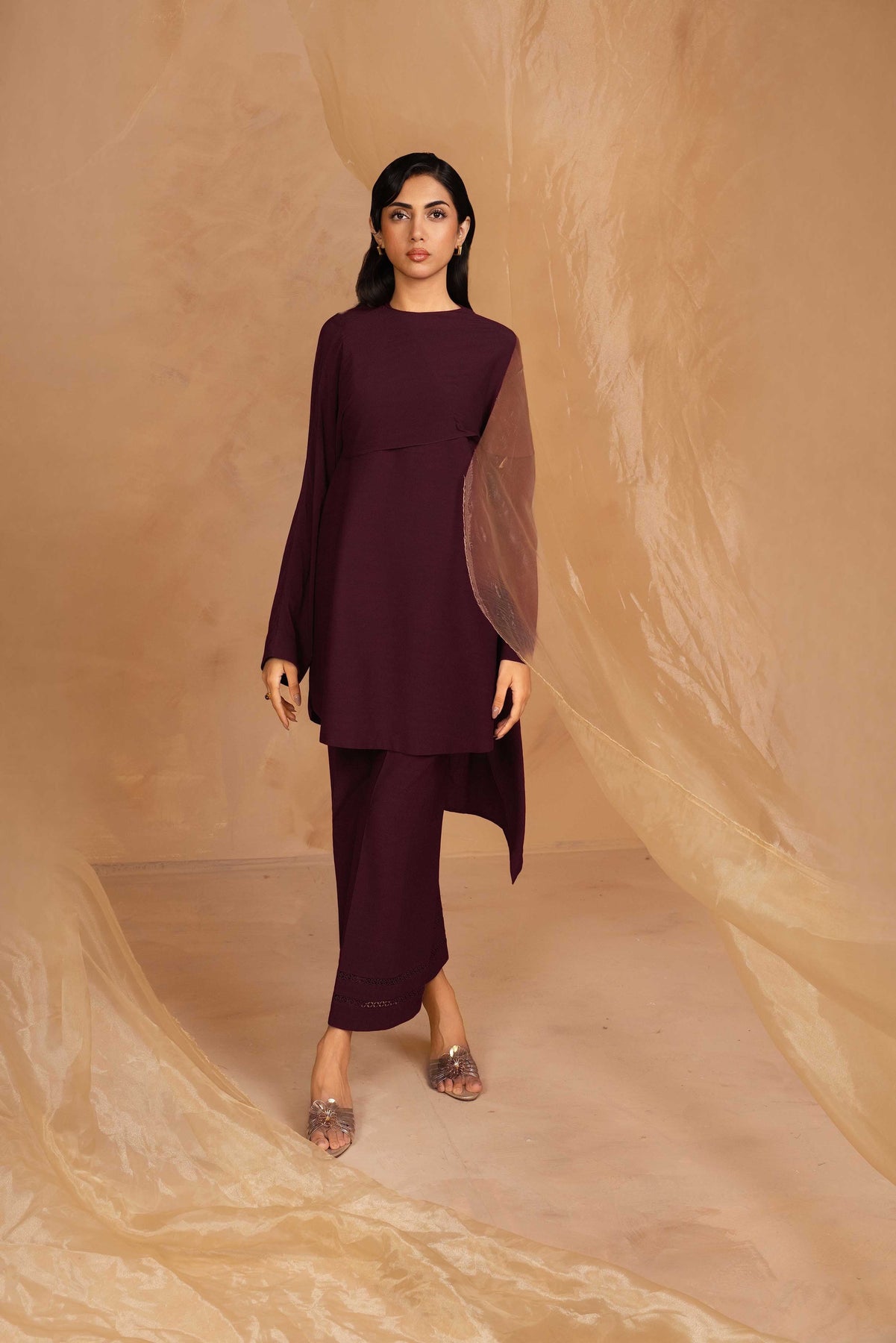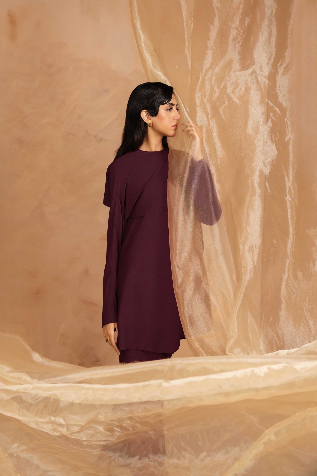 This contemporary ensemble, fashioned from pure viscose crepe, drapes beautifully in a rich, solid maroon hue. The relaxed tunic is elevated by a dramatic cape-style overlay, while the coordinating trousers feature a delicate, contrasting lace detail at the hem.