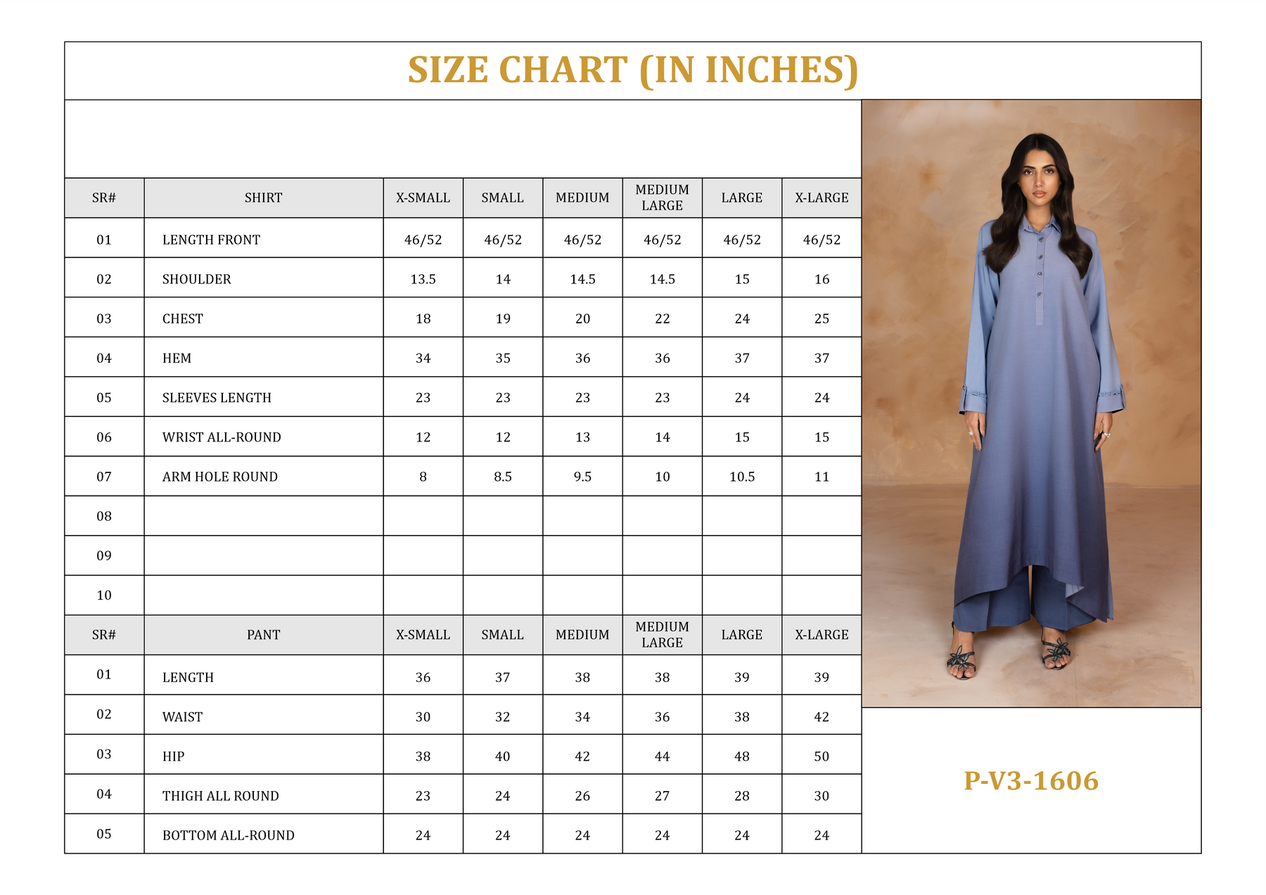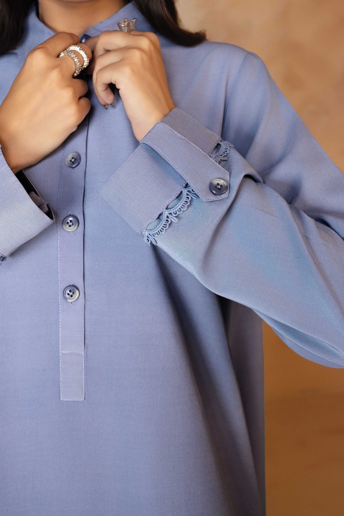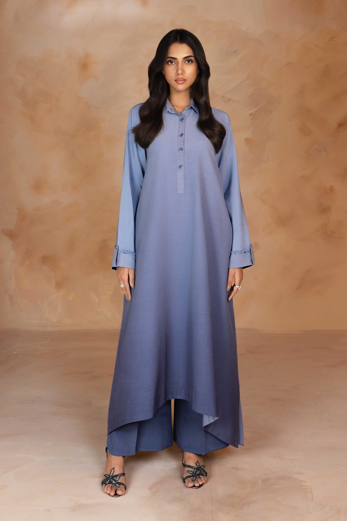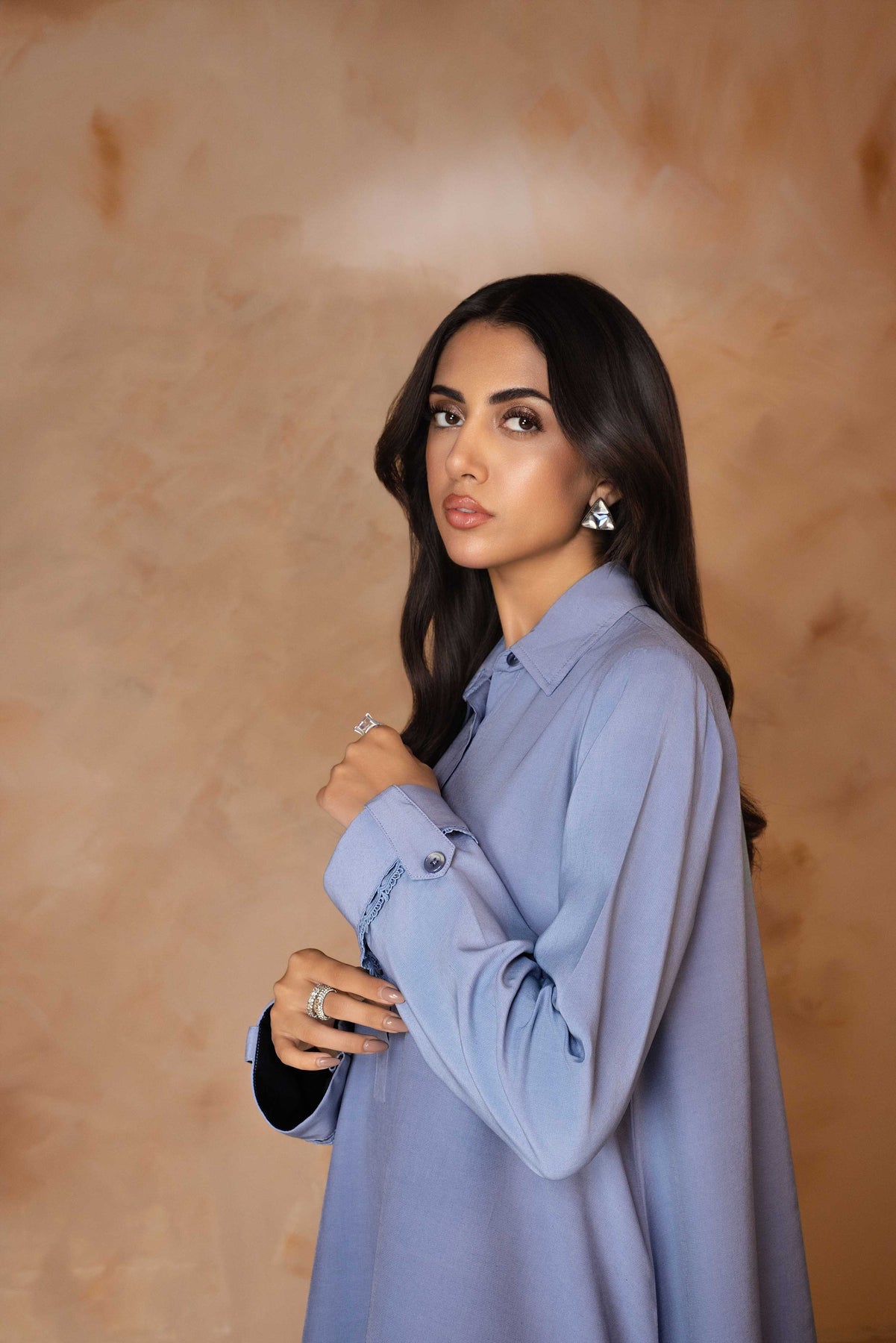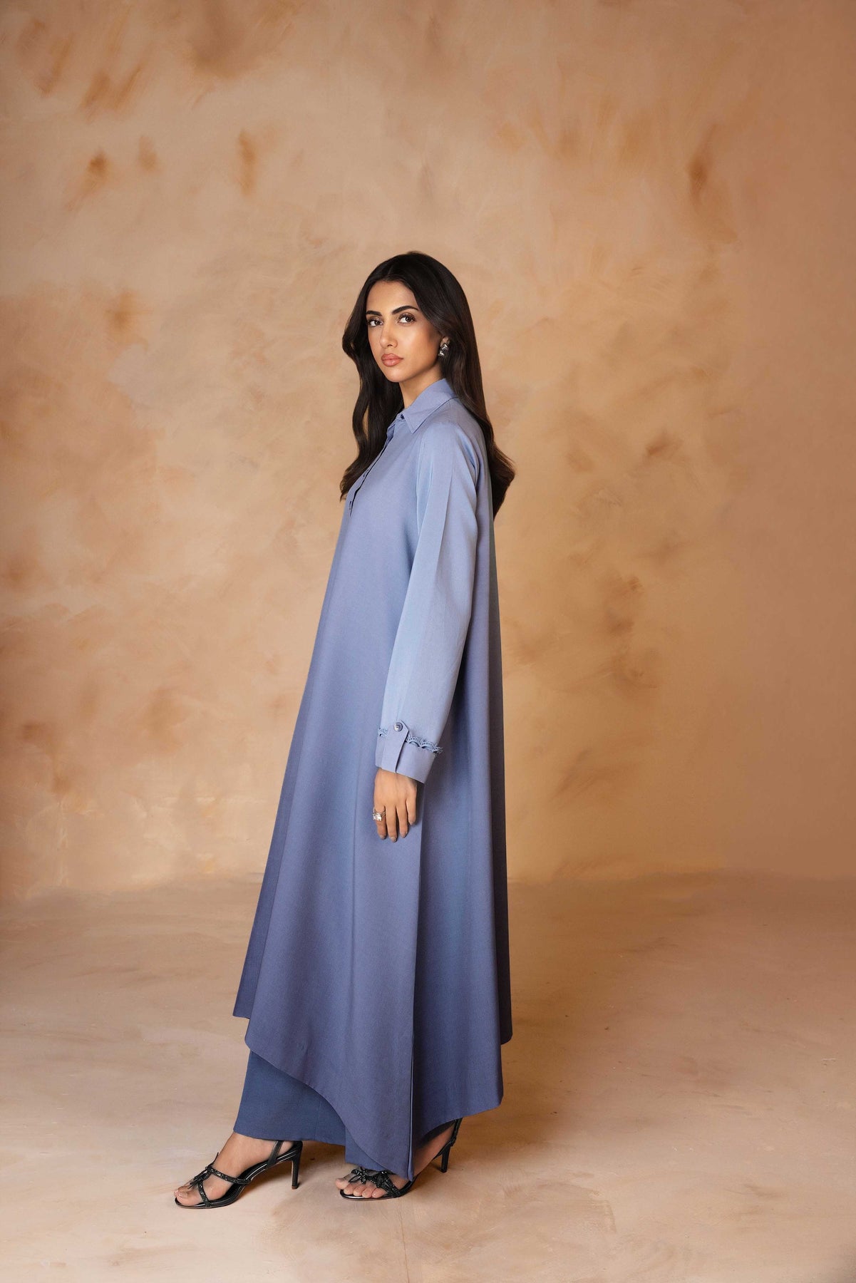 Crafted from pure viscose crepe, this elegant ensemble showcases a unique ombré effect, graduating from a soft to a deep dusty blue. The long, flowing tunic features a buttoned placket and collared neckline, with delicate stitching detail adorning the cuffs.